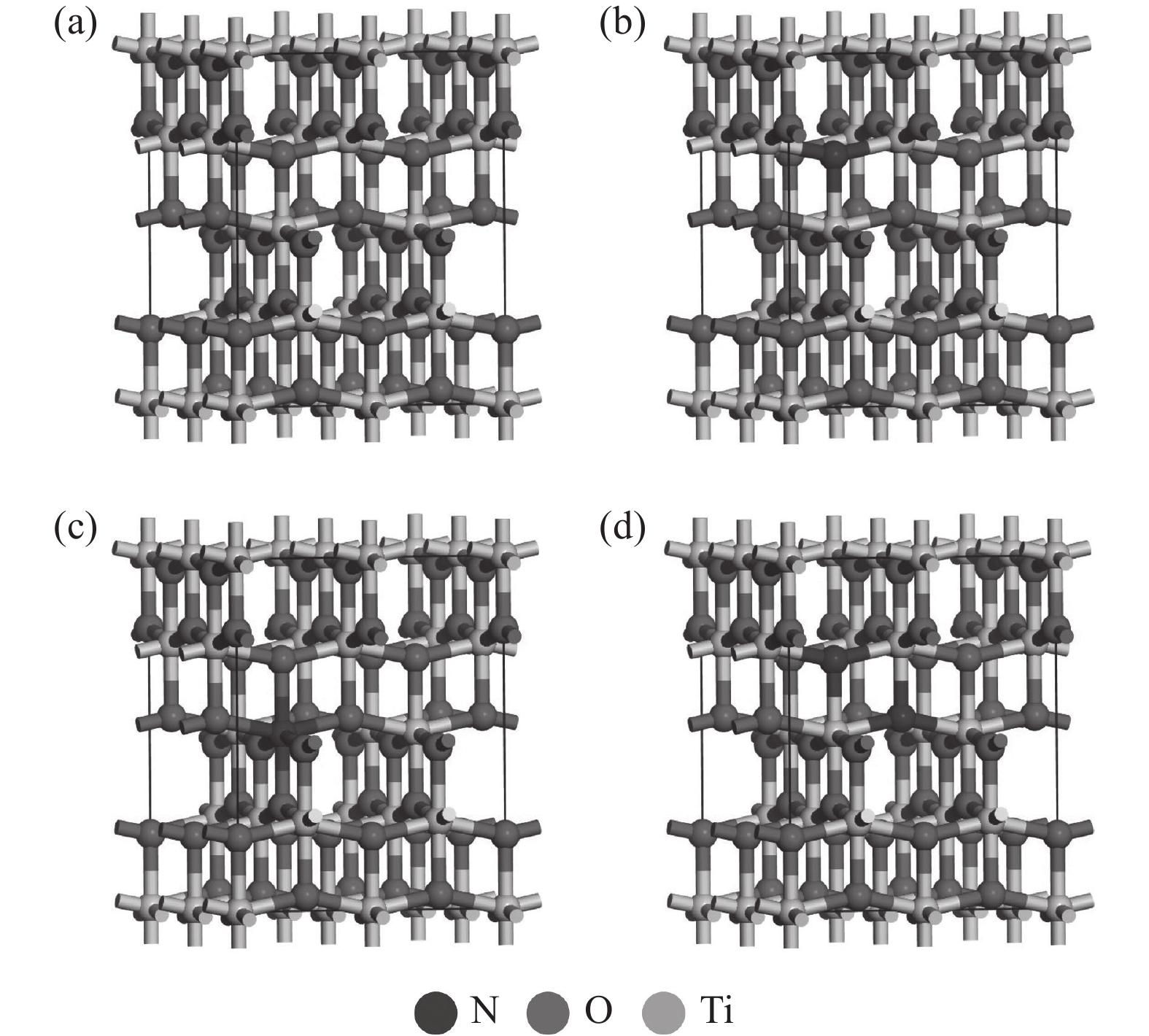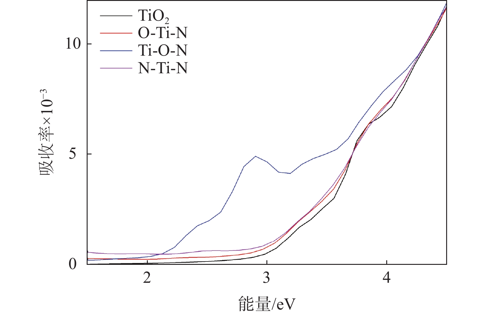 通過氮原子取代不同位置的Ti或者O原子,構(gòu)建了三種不同摻雜結(jié)構(gòu)的氮摻雜TiO2:O-Ti-N、Ti-O-N和N-Ti-N。基于密度泛函理論,第一性原理計算研究了三種氮摻雜結(jié)構(gòu)對于TiO2的晶體結(jié)構(gòu)、能帶結(jié)構(gòu)、態(tài)密度和光學(xué)性質(zhì)的影響。研究結(jié)果表明:三種摻雜結(jié)構(gòu)都可以穩(wěn)定地存在于TiO2中,符合文獻(xiàn)報道。氮原子的摻雜顯著降低了TiO2的禁帶寬度。由于N 2p和O 2p之間的雜化作用,在禁帶區(qū)域形成雜質(zhì)能級,降低了激發(fā)電子向?qū)кS遷所需的能量。Ti-O-N摻雜結(jié)構(gòu)的TiO2吸收光譜發(fā)生了明顯的紅移現(xiàn)象,說明該結(jié)構(gòu)更有利于提高TiO2在可見光范圍的光催化活性。