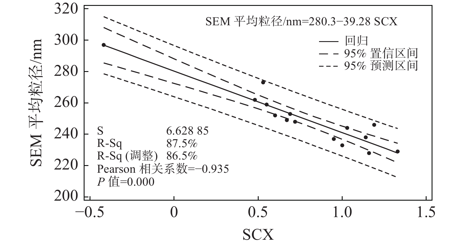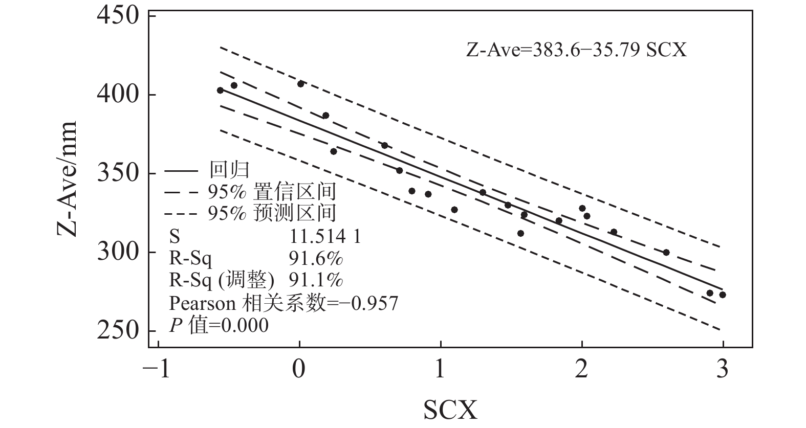 采用不同的K2O、P2O5、ZnO鹽處理配方處理偏鈦酸,煅燒后得到金紅石含量合格的硫酸法鈦白初品,檢測藍(lán)相指標(biāo)SCX、ZS90平均粒徑Z-Ave和SEM平均粒徑,并通過線性擬合和回歸等手段分析三者之間的線性相關(guān)性。結(jié)果表明,鈦白初品的ZS90平均粒徑Z-Ave和SEM平均粒徑與SCX的線性相關(guān)性指標(biāo)Pearson相關(guān)系數(shù)分別達(dá)到了?0.957和?0.935,說明該兩項粒徑指標(biāo)大小均與SCX值成負(fù)線性相關(guān)性。SCX與Z-Ave線性回歸方程的R-Sq達(dá)到了91.6%,SCX與SEM平均粒徑線性回歸方程的R-Sq達(dá)到了87.5%,線性回歸結(jié)果表明,采用SCX值對Z-Ave的預(yù)測有效性要稍高于對SEM平均粒徑的預(yù)測有效性。鈦白粉廠家可將常規(guī)監(jiān)測指標(biāo)SCX值帶入相應(yīng)的擬合方程式來對產(chǎn)品粒徑進(jìn)行統(tǒng)計分析和跟蹤,并據(jù)此對工藝技術(shù)進(jìn)行調(diào)整。