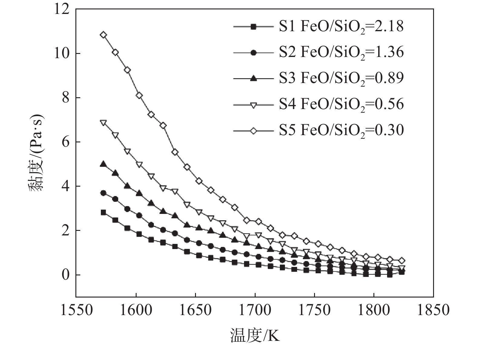 研究了在切削廢料還原熔融釩渣提鐵的工藝進(jìn)程中熔渣體系黏度的變化規(guī)律,并通過對釩渣體系熔體結(jié)構(gòu)的研究,從微觀結(jié)構(gòu)角度揭示了熔體中結(jié)構(gòu)單元對宏觀黏度的作用機(jī)理。結(jié)果表明,隨還原反應(yīng)進(jìn)行,渣中FeO含量不斷降低,SiO2含量增加,渣中自由氧離子減少,無法破壞硅酸鹽的鏈、環(huán)狀結(jié)構(gòu),導(dǎo)致渣中孤立體、二聚體等簡單硅酸鹽結(jié)構(gòu)單元減少,鏈、層狀等復(fù)雜硅酸鹽結(jié)構(gòu)單元增加,熔體聚合度增強(qiáng),渣系黏度逐漸增加。