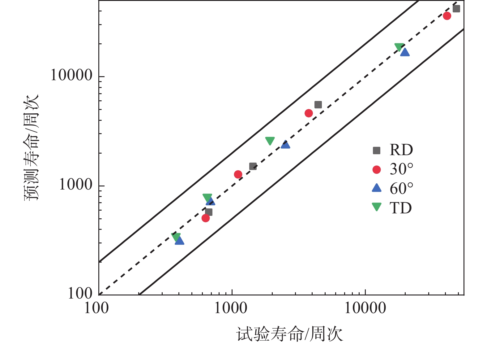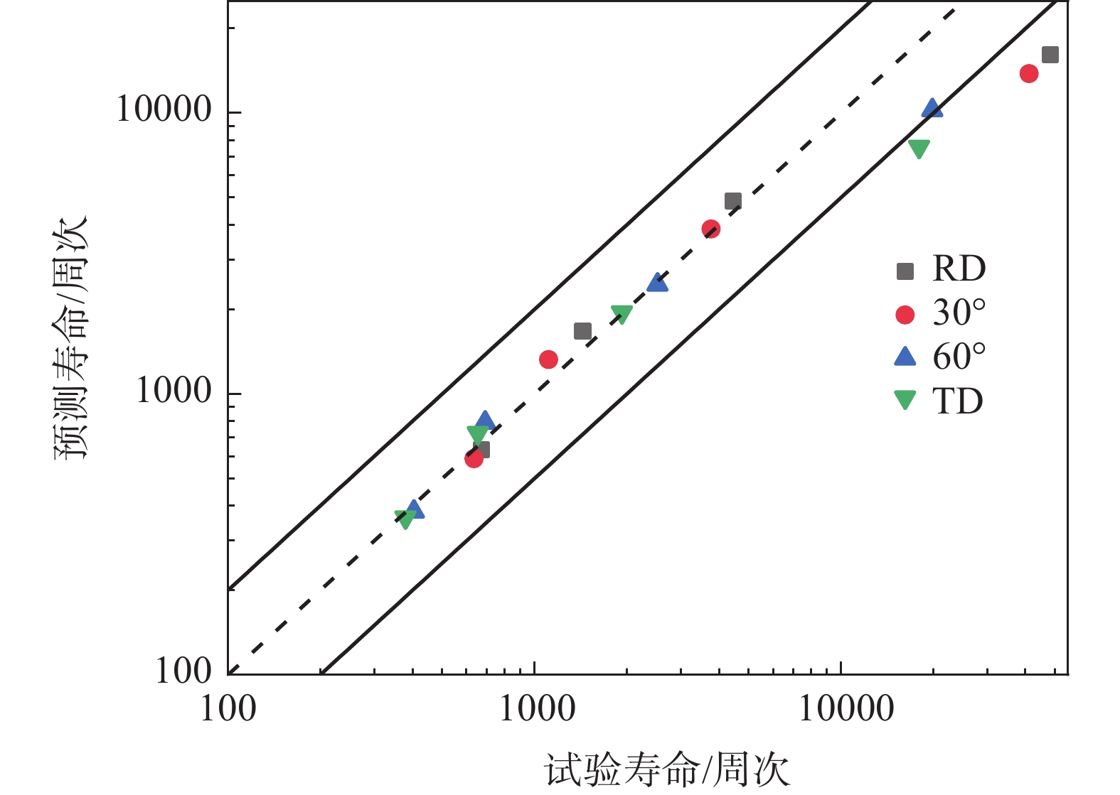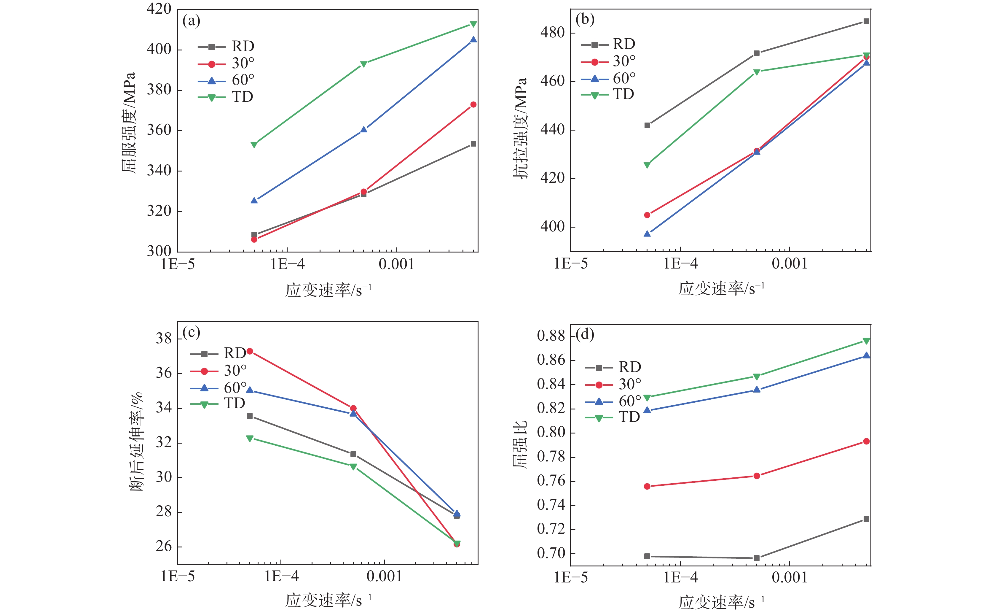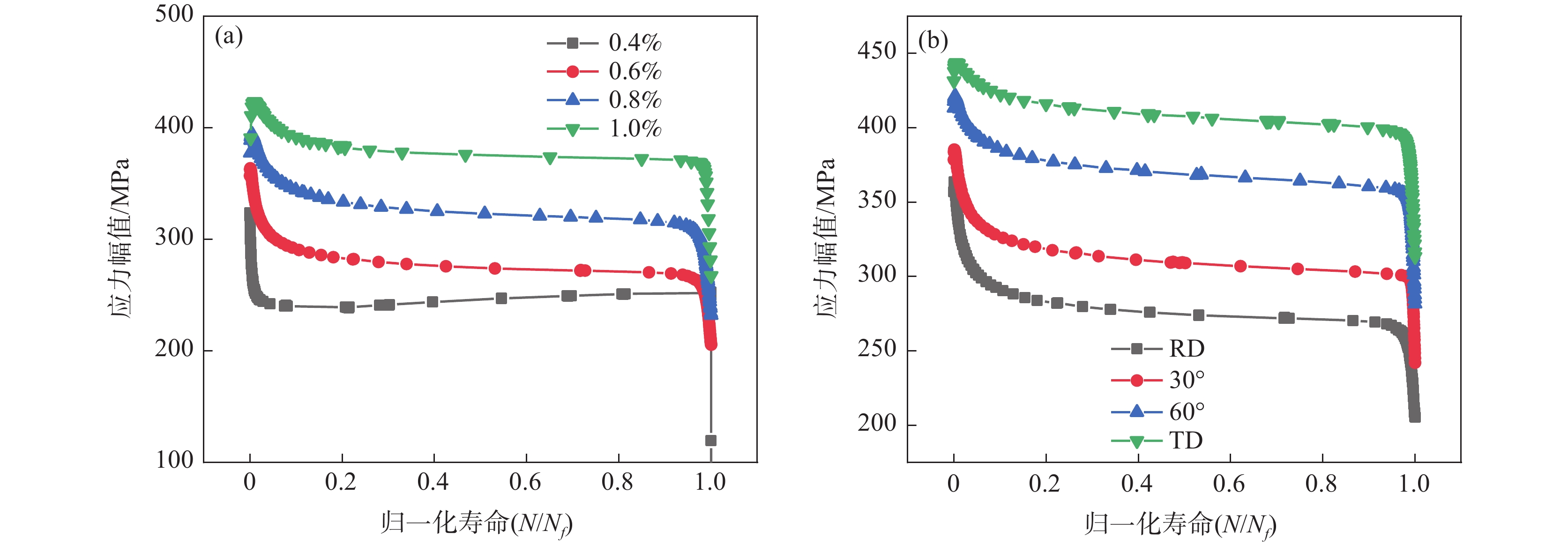 為系統(tǒng)研究工業(yè)純鈦TA2拉伸性能及低周疲勞性能的各向異性,沿軋制方向(RD)、與RD呈30°方向(RD-30°)、與RD呈60°方向(RD-60°)及垂直軋制方向(TD)開展了室溫拉伸及低周疲勞試驗。結(jié)果表明:隨著取樣角度增加,屈服強(qiáng)度增加,屈強(qiáng)比上升,材料的塑性下降。基于Hollomon模型及Johnson-Cook模型對工業(yè)純鈦真實應(yīng)力應(yīng)變曲線進(jìn)行預(yù)測,發(fā)現(xiàn)Hollomon模型預(yù)測精度更高。低周疲勞試驗結(jié)果表明:不同取樣方向的試樣均呈現(xiàn)循環(huán)軟化特征,隨著取樣角度增加,恒定應(yīng)變幅下循環(huán)應(yīng)力幅值增加,總的應(yīng)變能密度增加,導(dǎo)致疲勞壽命呈下降趨勢。不同取向試樣的低周疲勞壽命滿足Manson-coffin經(jīng)驗關(guān)系式。