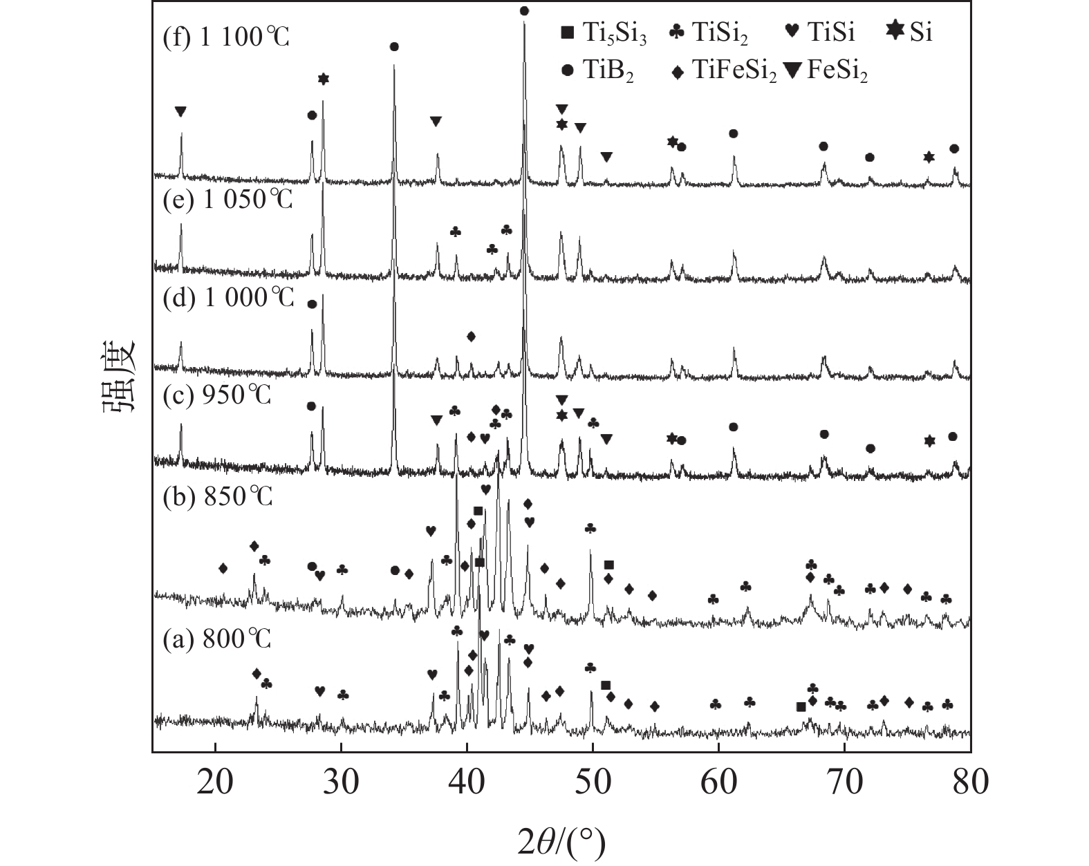 以從高鈦型高爐渣中提取的Ti-Si-Fe合金和無定形硼粉為原料,在NaCl-KCl熔鹽中合成了TiB2粉體,研究了反應(yīng)溫度、保溫時間、熔鹽量、B/Ti摩爾比對反應(yīng)進(jìn)程的影響。結(jié)果表明:提高反應(yīng)溫度或延長保溫時間均能促進(jìn)反應(yīng)進(jìn)行,在850 ℃時開始有TiB2生成,1100 ℃時反應(yīng)完全。熔鹽有促進(jìn)反應(yīng)過程的作用。元素分布表明,含F(xiàn)e的顆粒同時含Si,這與產(chǎn)物FeSi2相對應(yīng);大多數(shù)顆粒同時含有Si、Ti、B,說明在這些顆粒中產(chǎn)物TiB2和Si是伴生在一起的;少數(shù)顆粒只含有Ti、B,對應(yīng)產(chǎn)物TiB2。產(chǎn)物顆粒形貌有兩種,一種顆粒表面呈龜裂狀,有裂縫或微米級孔洞與顆粒內(nèi)部相連,這種顆粒同時含有TiB2、Si或FeSi2;另一種顆粒由片狀TiB2組成。Ti-Si-Fe合金與B在熔鹽中的反應(yīng)機(jī)制為:在熔鹽促進(jìn)作用下,含鈦物中的Ti與B反應(yīng)生成TiB2,釋放出Si及FeSi2,大部分TiB2以Si、FeSi2為骨架形核并長大,從而維持了顆粒原有形貌,少量TiB2在熔鹽中形核并長大形成片狀TiB2的聚集體。合金相與B反應(yīng)完全的先后順序依次為:Ti5Si3、TiSi、TiFeSi2和TiSi2