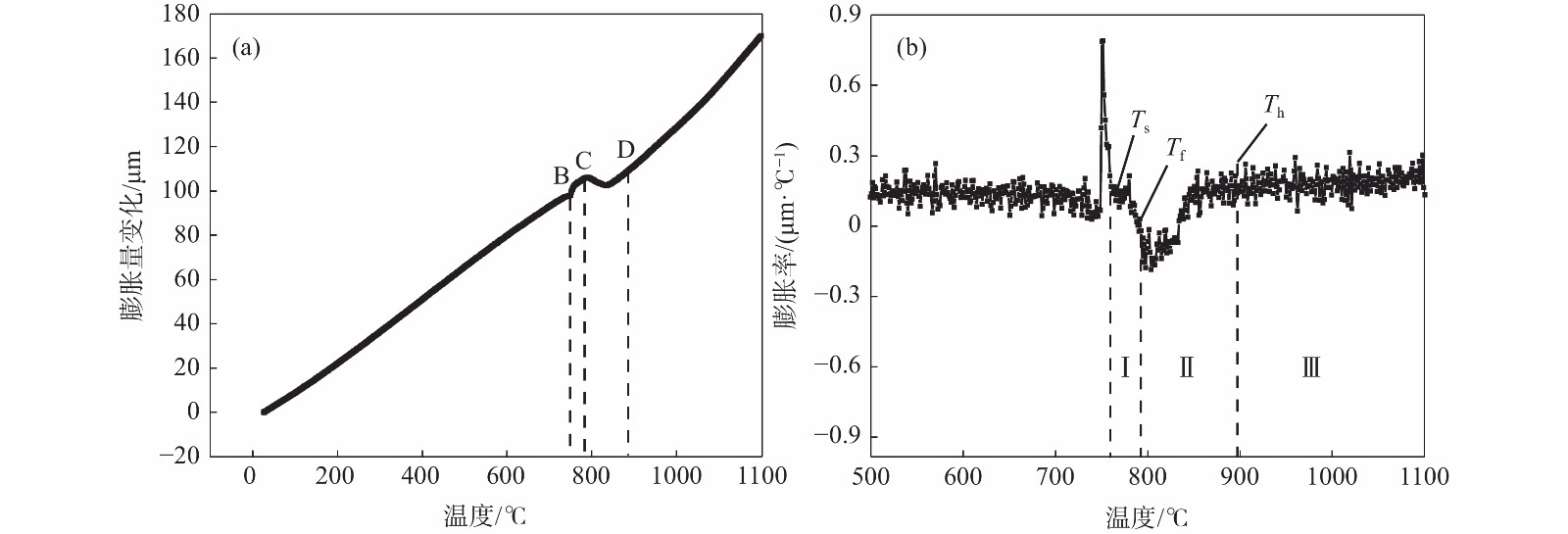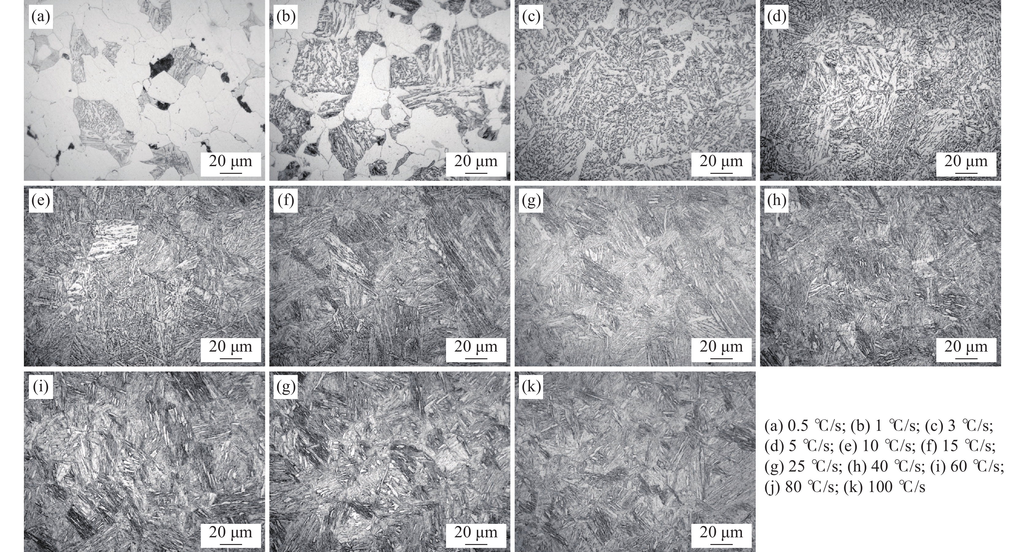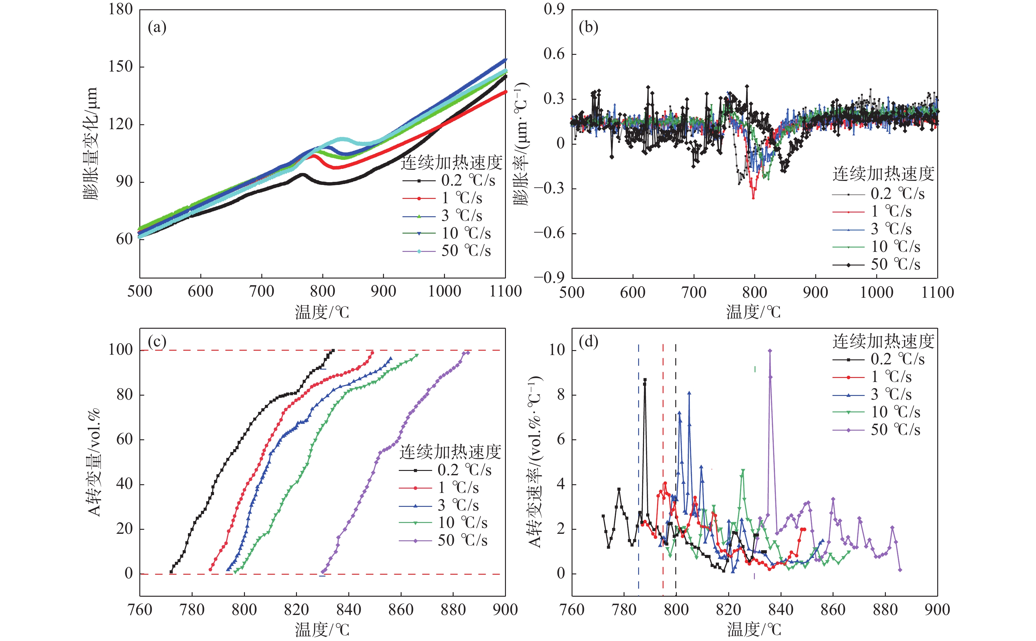 利用DIL805A熱膨脹儀記錄了鑄態(tài)60Si2Mn鋼在不同的加熱速率下(0.2、1、3、10、50 ℃/s)的線膨脹系數(shù),獲得了各自的熱膨脹曲線和奧氏體體積轉(zhuǎn)變分?jǐn)?shù)曲線,研究了加熱速率對奧氏體化的影響。采用高溫金相顯微鏡對該鋼在連續(xù)加熱過程中的奧氏體轉(zhuǎn)變過程進(jìn)行了觀察分析。結(jié)果表明:60Si2Mn鋼在連續(xù)加熱過程中的奧氏體轉(zhuǎn)變可分為三個階段:珠光體向奧氏體的轉(zhuǎn)變、(Mn,Fe)3C向奧氏體中的溶解和奧氏體的成分均勻化。隨著加熱速率提高,相變臨界溫度提高,相變速率提高。通過高溫金相可以觀察到,在連續(xù)加熱過程中,鑄態(tài)60Si2Mn鋼的A轉(zhuǎn)變是一個形核和長大交替進(jìn)行的過程,并且由于Si元素含量的不同,導(dǎo)致這個過程是不連續(xù)的。