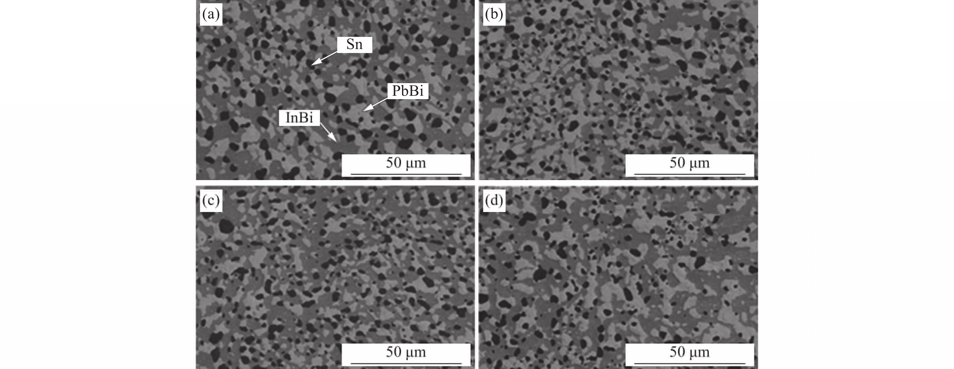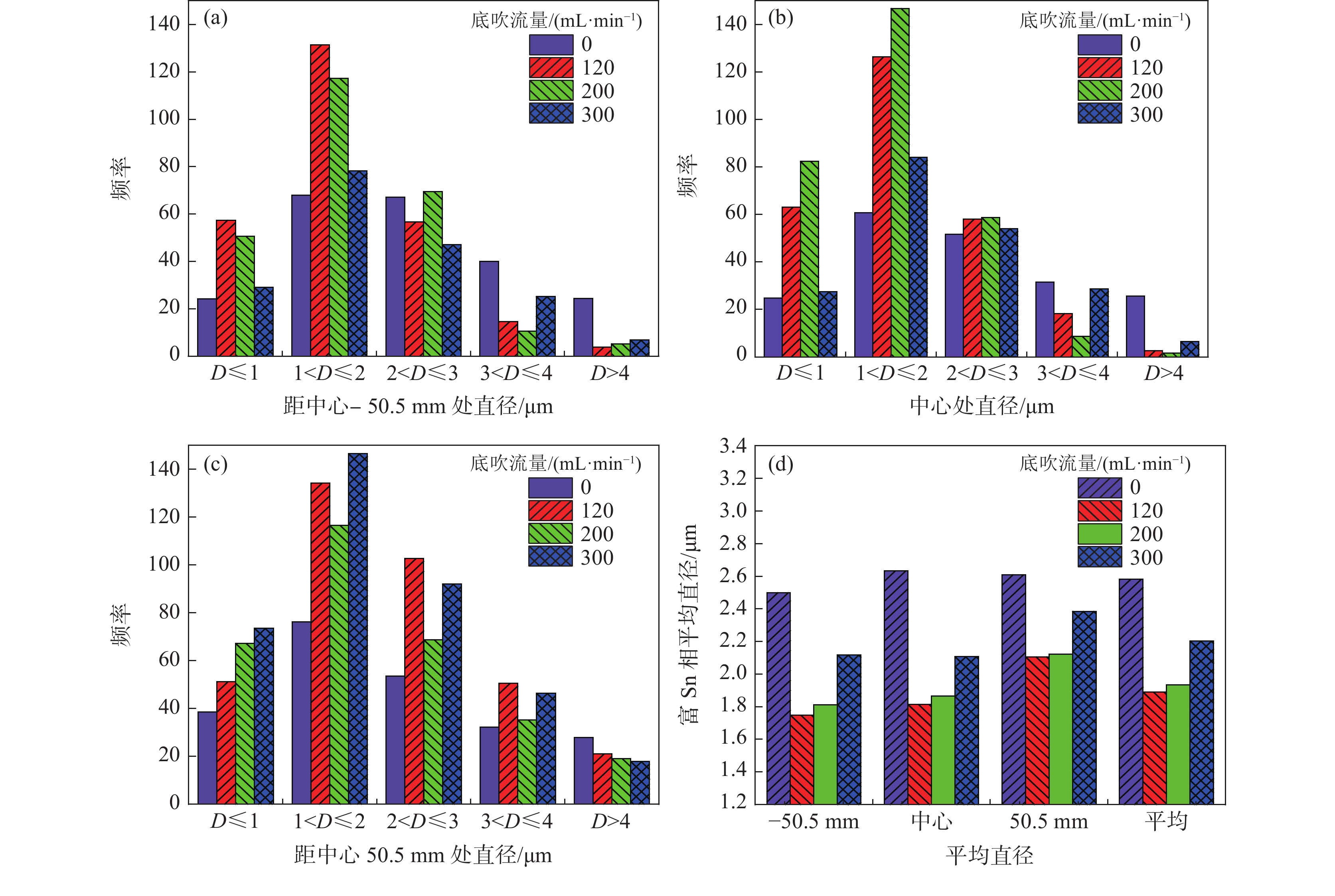 采用低熔點Pb18Sn12In21Bi49(質(zhì)量分?jǐn)?shù))合金,在不銹鋼的錠模中進(jìn)行澆鑄過程底吹氬試驗。利用熱電偶測定模內(nèi)不同位置的溫度,并采用掃描電鏡(SEM)對凝固試樣進(jìn)行鑄態(tài)相組織觀察,研究了澆鑄過程底吹氬對合金液溫度與合金凝固相組織的影響。試驗結(jié)果表明,澆鑄過程無底吹時,水平方向中心測溫點的溫度下降很緩慢,澆鑄結(jié)束后該點的溫度驟降到凝固等溫平臺溫度。當(dāng)澆鑄過程底吹氬時,中心點溫度以較快的溫降速率降低到凝固溫度。無底吹氬時,在豎直方向,合金液從下自上依次開始凝固,而底吹氬時,各監(jiān)測點幾乎同時開始凝固。在相同的冷卻條件下,澆鑄過程底吹氬顯著延遲模型下部的開始凝固時間。無底吹氬時檢測截面上富Sn相平均直徑在2.58 μm,當(dāng)進(jìn)行底吹氬時,可以有效改善凝固相組織粒徑分布,細(xì)化合金鑄態(tài)相組織,截面上富Sn相平均直徑約為1.89~2.20 μm, 較無底吹時降低了26.7%~14.7%。