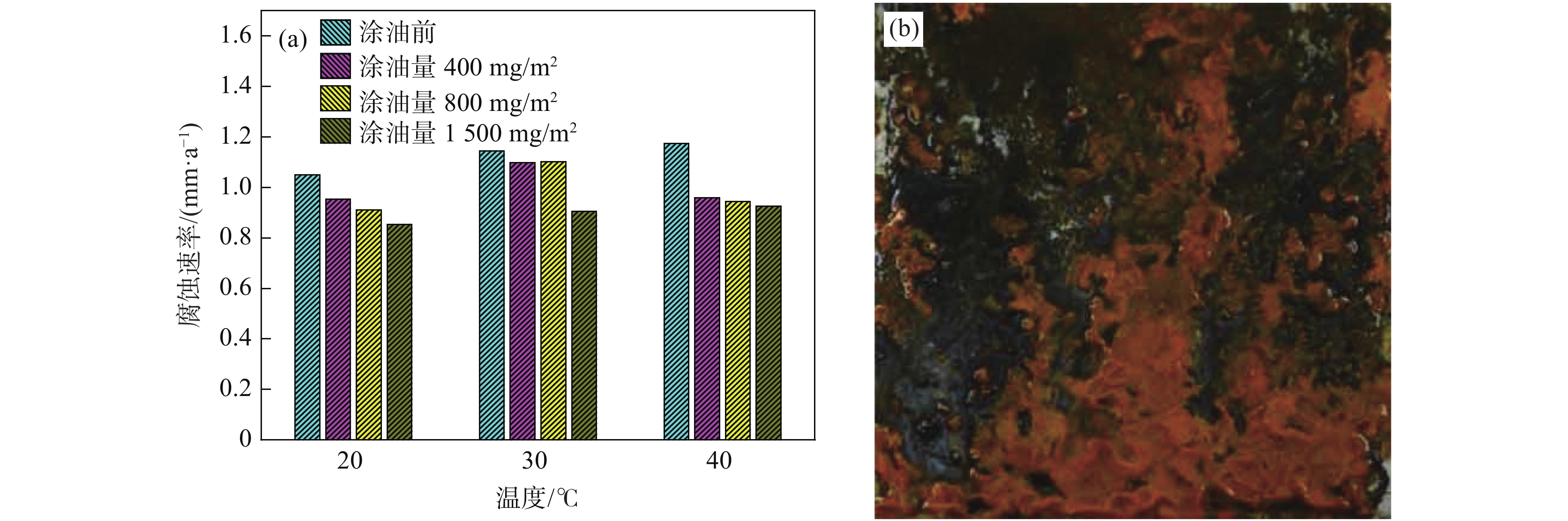 利用恒溫恒濕試驗、電化學(xué)極化曲線測試及微區(qū)電化學(xué)阻抗測試試驗對不同涂油量的DC06鋼板在不同溫度條件下的腐蝕規(guī)律進(jìn)行了研究。結(jié)果表明:DC06鋼板的腐蝕速率隨溫度增加而逐步提高,且當(dāng)溫度為40 ℃時,發(fā)生了嚴(yán)重的點蝕現(xiàn)象,隨溫度增加,腐蝕加快的程度越高。隨著涂油量增加至1500 mg/m2,鋼板的腐蝕速率下降了20%左右;DC06鋼板在粗糙度為1.2 μm時具有最佳的耐腐蝕性能;DC06鋼板腐蝕產(chǎn)物的活性溶解程度隨溫度的增加而加大,防銹油無法在高溫條件下形成穩(wěn)定的保護(hù)膜層,鋼板表面存在不均勻的微區(qū)阻抗特性,共同導(dǎo)致高溫條件下DC06鋼板耐蝕能力的下降。