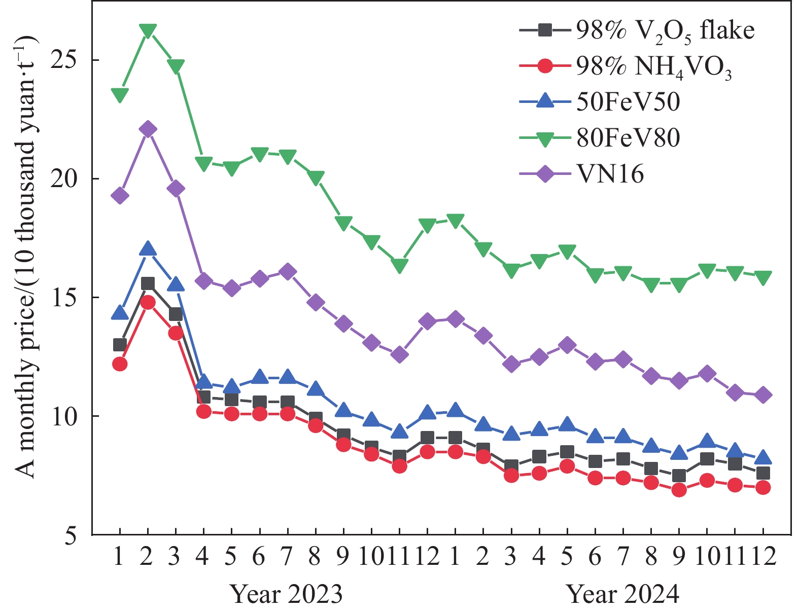 從全球釩資源、產品、產能、產量、需求、進出口貿易和市場價格等方面闡述和分析了2023~2024年釩產業的整體狀況,并基于目前國內外產業運行態勢對釩后市進行了展望,認為:全球釩產業已開始步入轉型發展新周期,我國需科學高效有序開發利用關鍵戰略金屬礦產資源中的釩;提前規劃并實施釩產業綠色低碳發展路徑;在可預見的未來,中國依舊是全球最大的釩供需市場,全球釩市場價格在多因素調控機制下,在一定區間內呈盤整回歸態勢;釩電池儲能將成為支撐新能源安全穩定應用的重要載體之一。