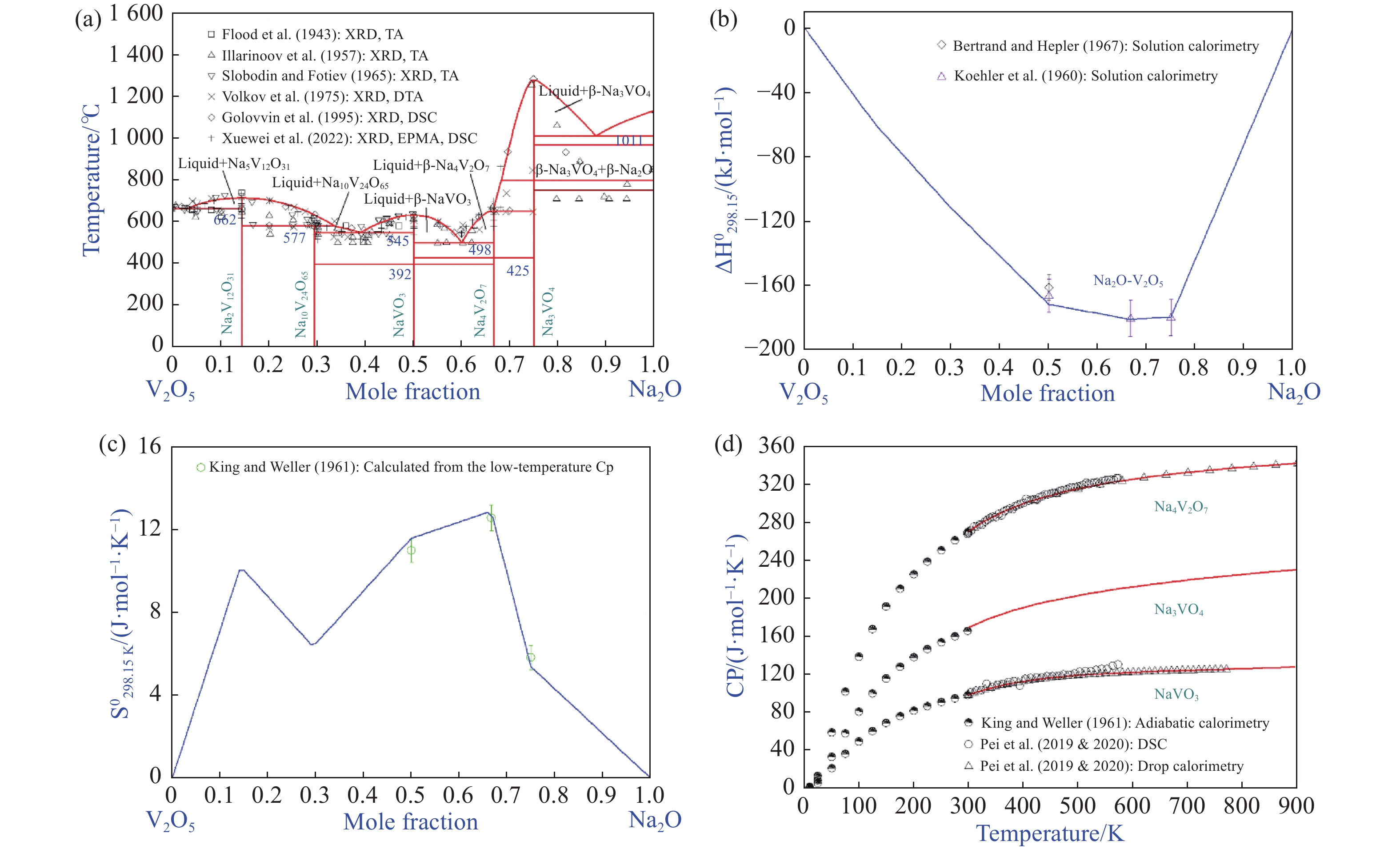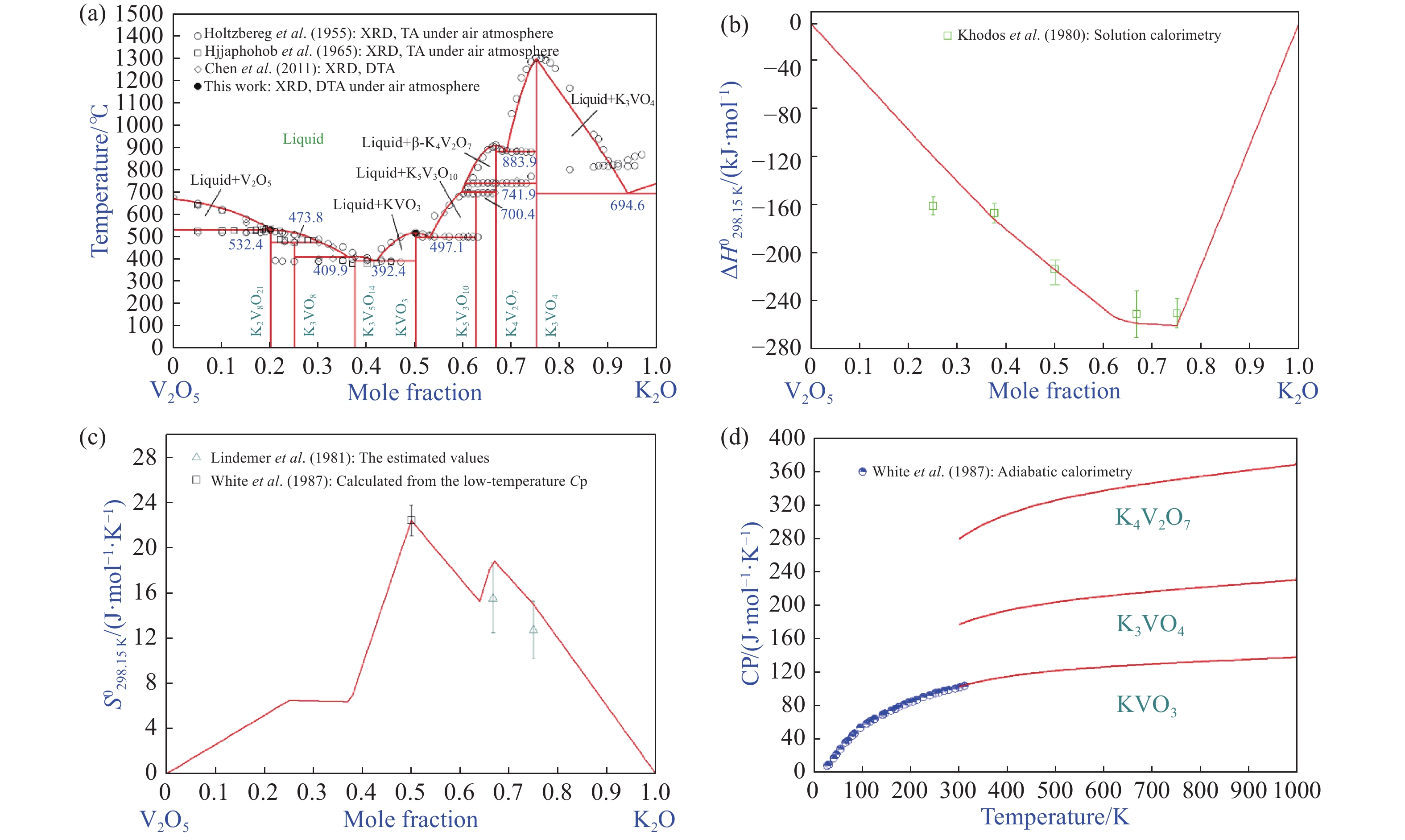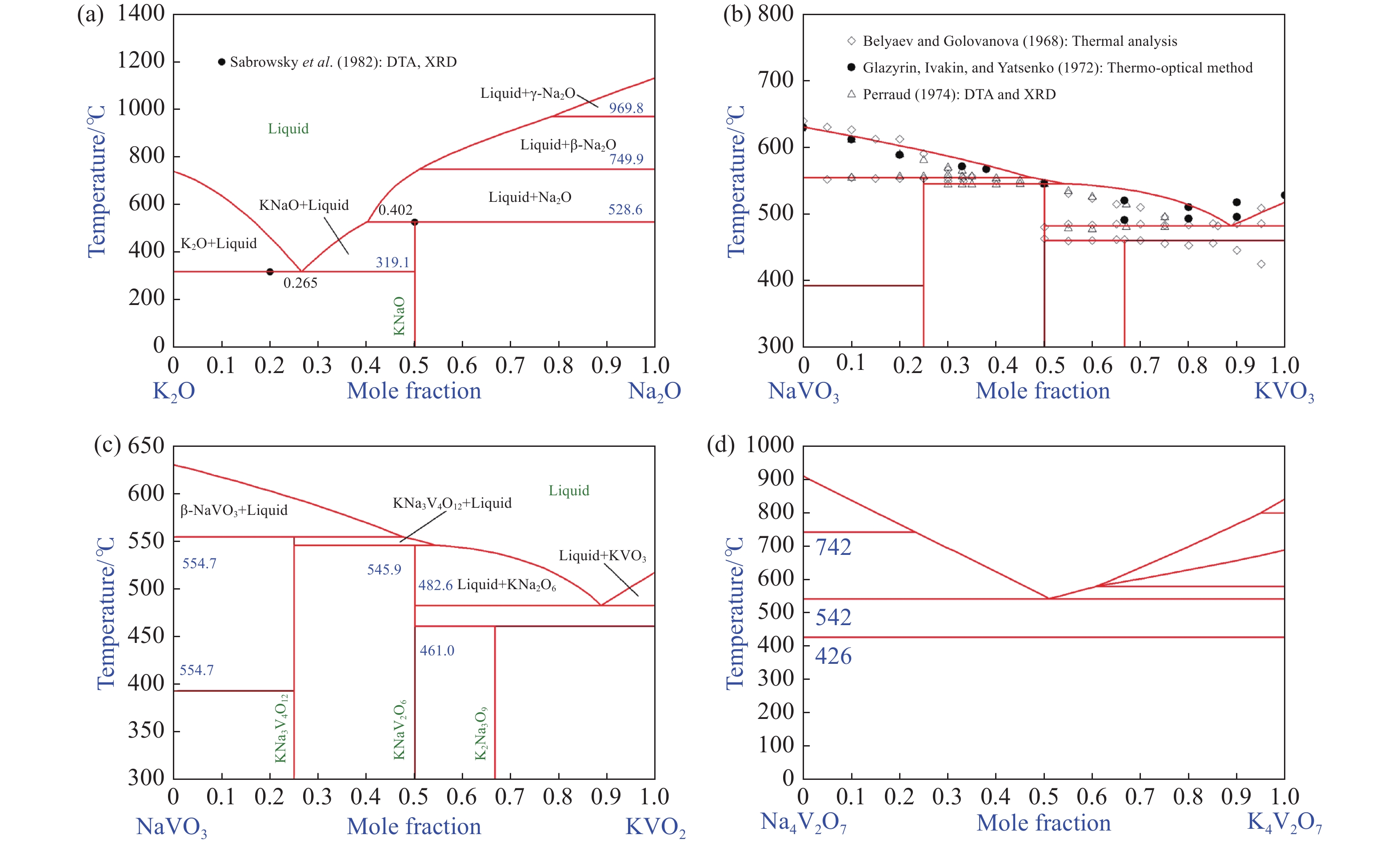 構建準確可靠的熱力學數據庫對提釩過程優化以及釩酸鹽材料的制備具有重要的應用價值和指導意義。采用封閉鉑金坩堝,結合X射線衍射(XRD)與差熱分析(DTA)技術,證實了K2O-V2O5體系中K3V5O14為穩定存在的化合物,并試驗測定了K2V8O21和KVO3的熔化溫度分別為532.4 ℃和516.5 ℃。隨后采用修正的準化學模型(MQM),引入溶液中第二相鄰陽離子短程有序對描述吉布斯自由能的變化。基于CALPHAD框架(CALculation of PHAse Diagram,相圖計算),構建了Na2O-K2O-V2O5體系的熱力學模型,重現了Na2O-K2O-V2O5體系全組分范圍的實驗數據和熱力學性質,獲得了該體系中所有物相一系列自洽的熱力學模型參數,最終構建了可靠的熱力學數據庫。進一步探討了當前數據庫在釩渣鈉化焙燒提釩中的應用,明確了含釩物相的遷移規律,確定了最佳的操作溫度窗口。