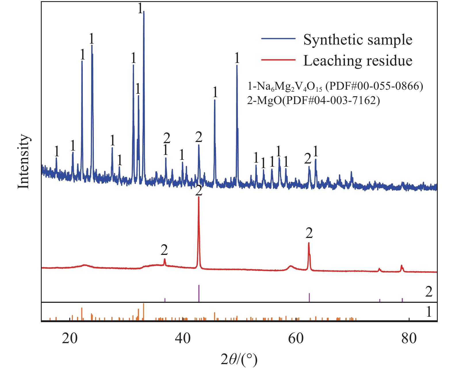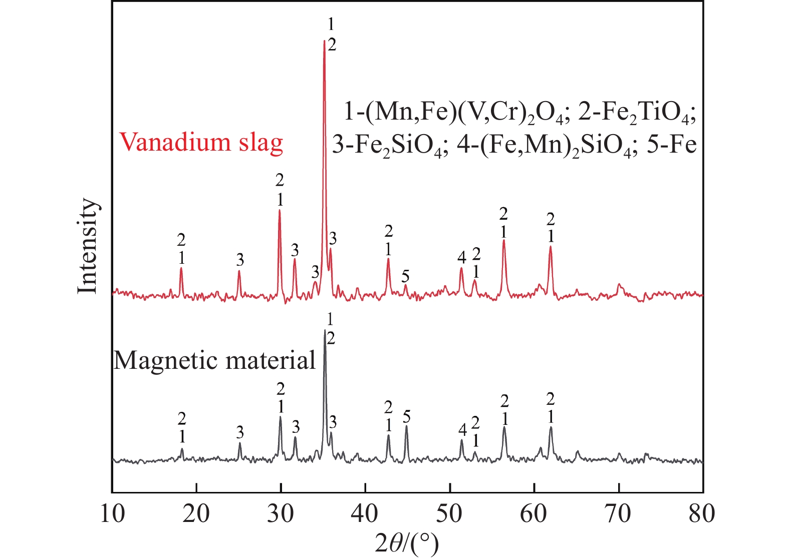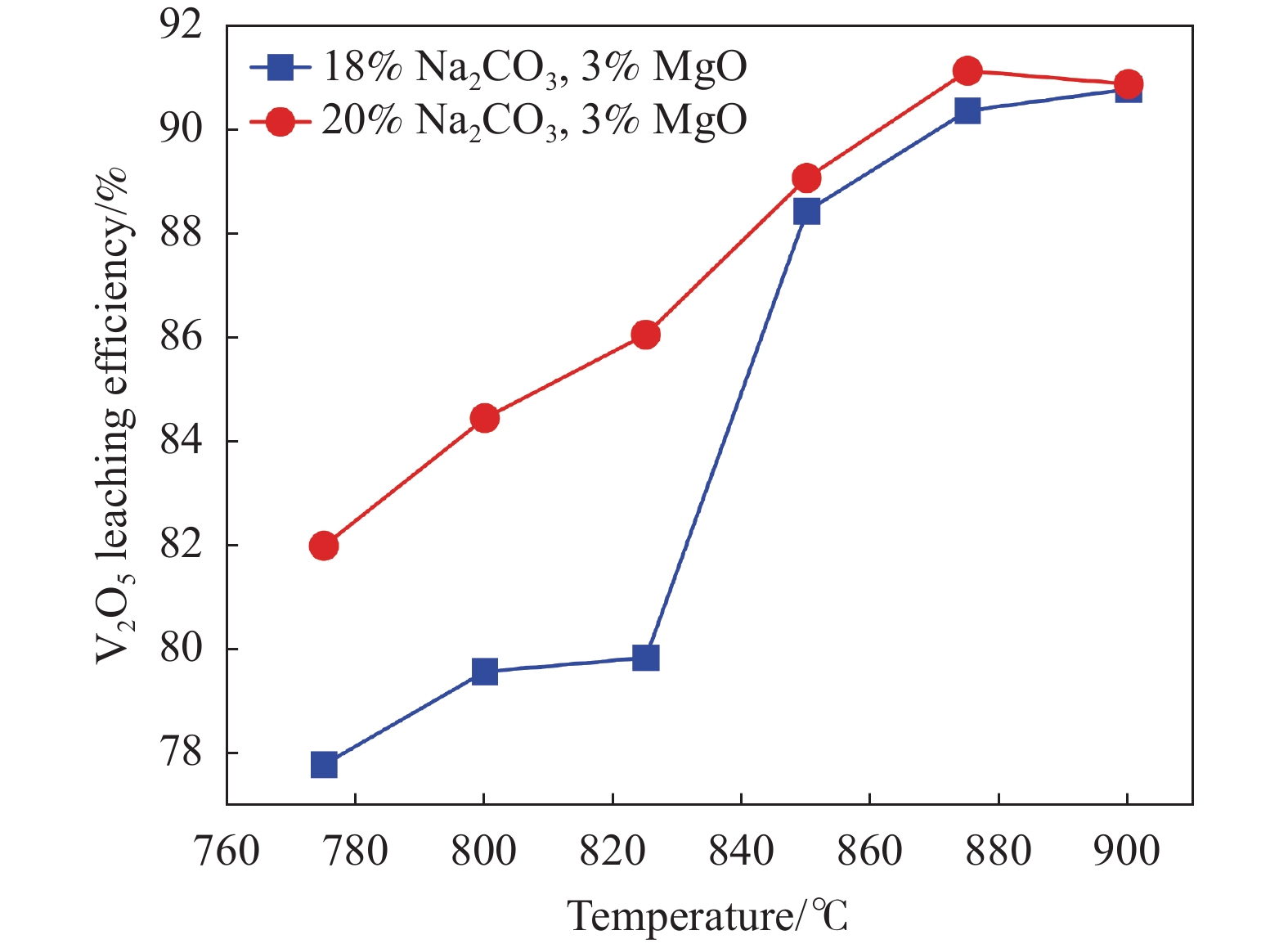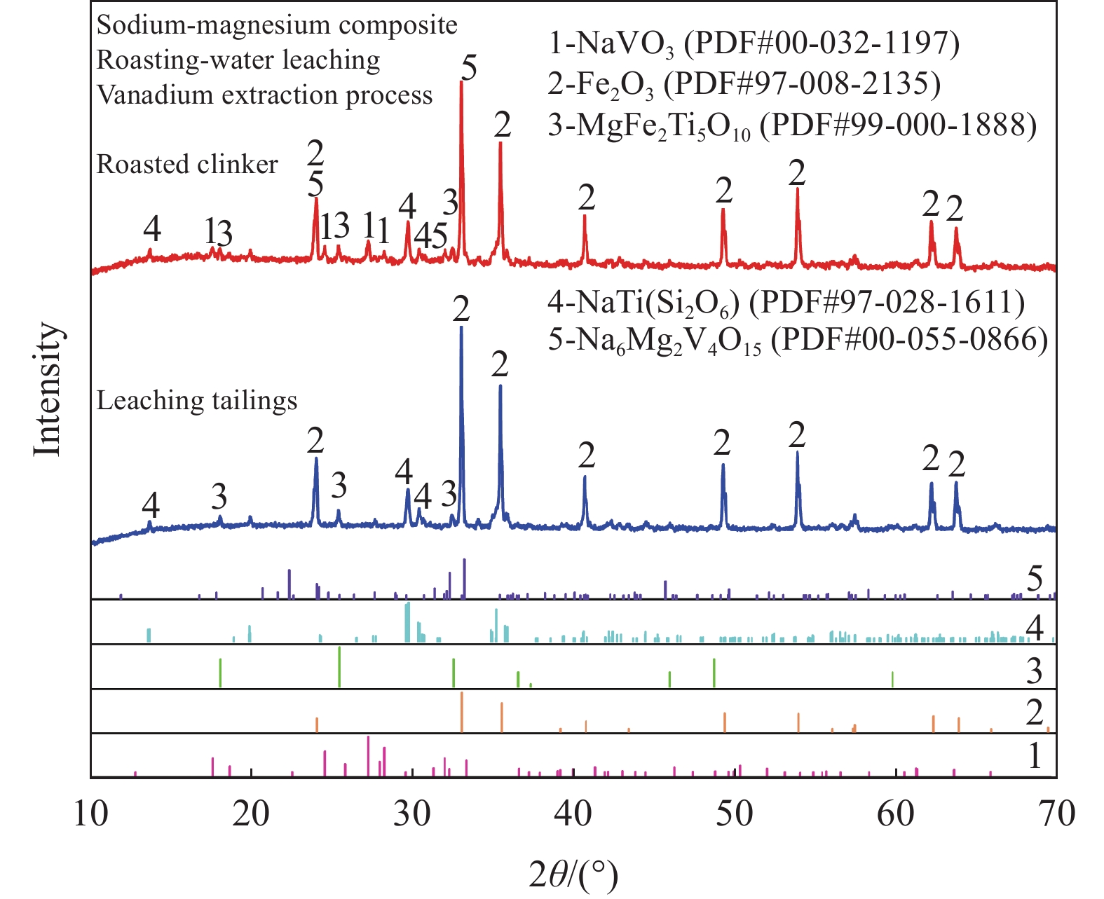釩渣鈉化焙燒過程中堿土金屬會很容易生成難溶于水的鈣/鎂釩酸鹽,導致釩收率下降。然而,適量添加氧化鎂可誘導生成高溶解度的鈉鎂復合釩酸鹽(Na6Mg2V4O15)。基于此,創新性提出釩渣鈉鎂復合焙燒提釩工藝。試驗結果表明,Na6Mg2V4O15在鈉化熟料水浸條件(pH≈11)下表現出優異的溶解性能;當Na2CO3配比為20%、焙燒溫度875 ℃時,釩渣鈉化焙燒釩浸出率最高可達85.30%;而采用鈉鎂復合焙燒,加入3%的MgO即可將Na2CO3配比降至18%,并將釩浸出率提升至90.38%。焙燒熟料和浸出渣的物相分析結果表明,復合焙燒有效促進了鈉鎂復合釩酸鹽的焙燒轉化及浸出。采用低成本鎂鹽部分替代鈉鹽進行復合焙燒,可為鈉化提釩工藝降本增效提供新思路。