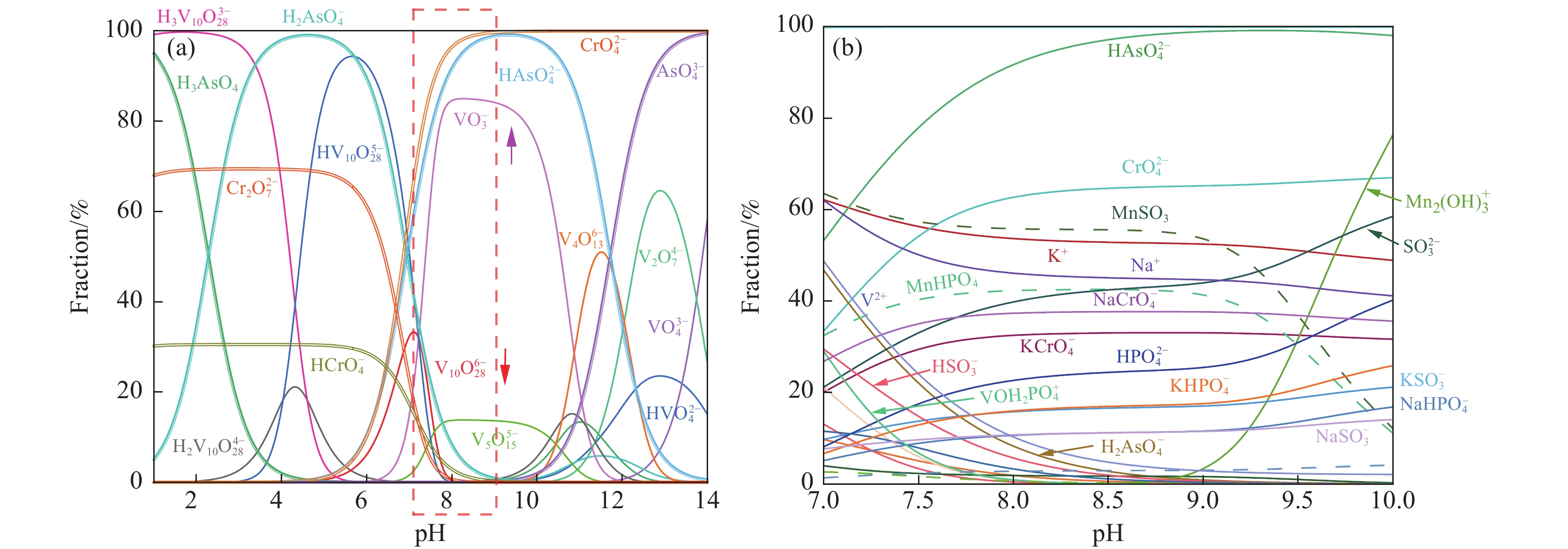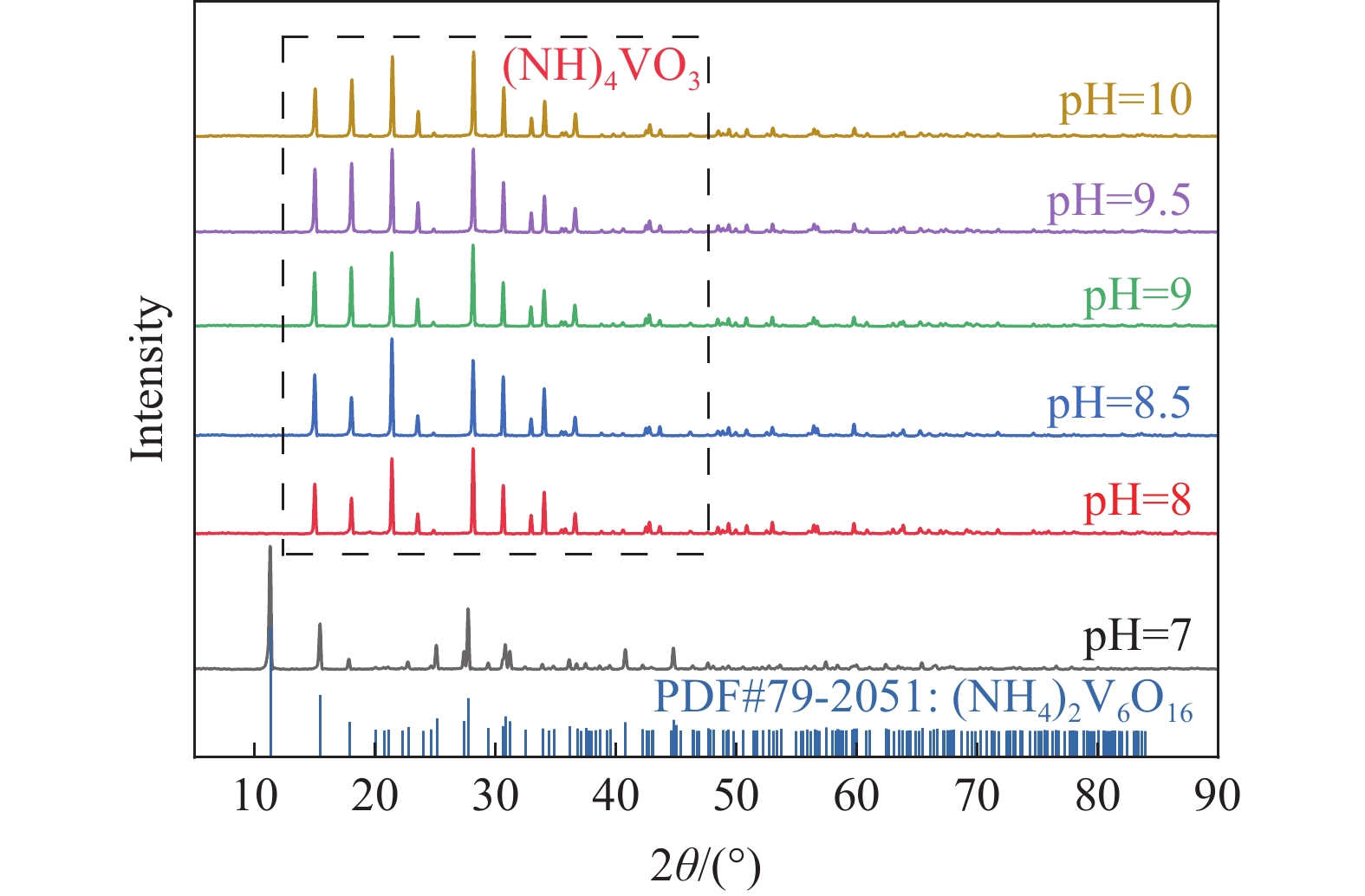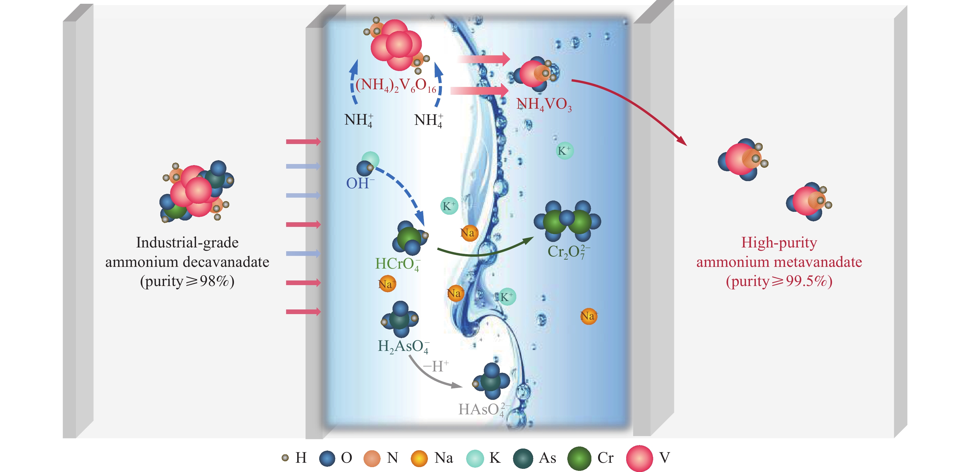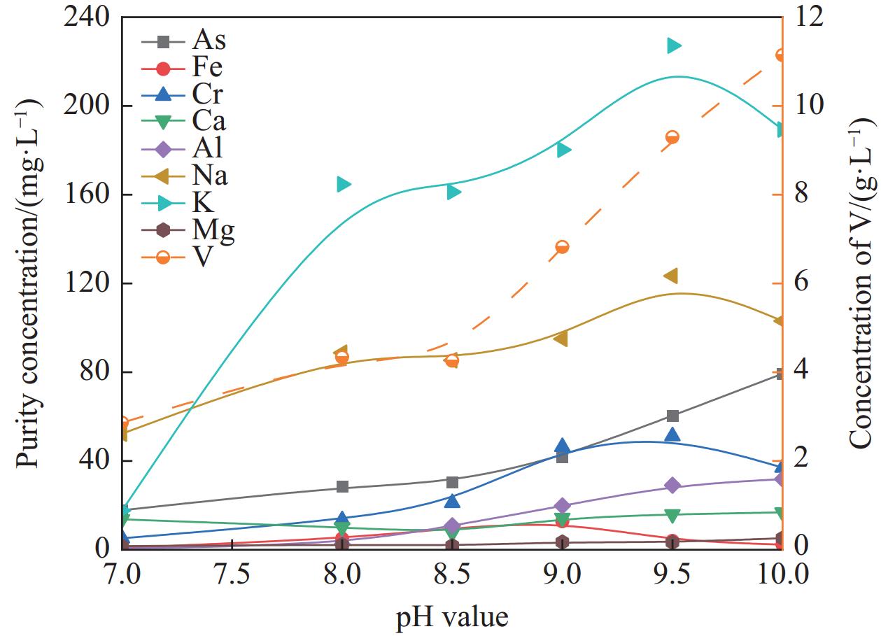 針對傳統偏釩酸銨制備工藝存在的流程冗長、成本高昂等問題,基于釩酸根離子在不同pH條件下的形態轉化特性,創新性地提出通過精確調控介質pH值實現多釩酸根(V10O286?)向偏釩酸根(VO3?)的直接轉化。在此過程中,雜質元素(Na、K、Cr、As)分別以Na+、K+、CrO42?、HAsO42?等離子形態進入溶液相,實現了偏釩酸銨制備過程中的雜質協同去除。系統研究了轉型反應溫度、pH值和液固比對釩回收率及產品純度的影響機制,試驗結果表明:當體系pH≥8時,可實現V10O286?向VO3?的完全轉化;較低的反應溫度有利于偏釩酸銨的結晶析出,從而提高釩回收率;液固比的增加雖有利于提高轉化效率,但過高的液固比會導致釩回收率降低和資源浪費。通過優化試驗確定了最佳工藝參數:反應溫度30 ℃,pH值8.5,液固比7~10。在此條件下,純度98%的工業級多釩酸銨可直接轉化為偏釩酸銨并結晶析出,所得產品純度達99.75%,釩回收率為90.67%,成功實現了純度≥99.5%偏釩酸銨的一步法制備。該方法顯著簡化了傳統工藝流程,為高效制備高純度偏釩酸銨提供了新的技術途徑。