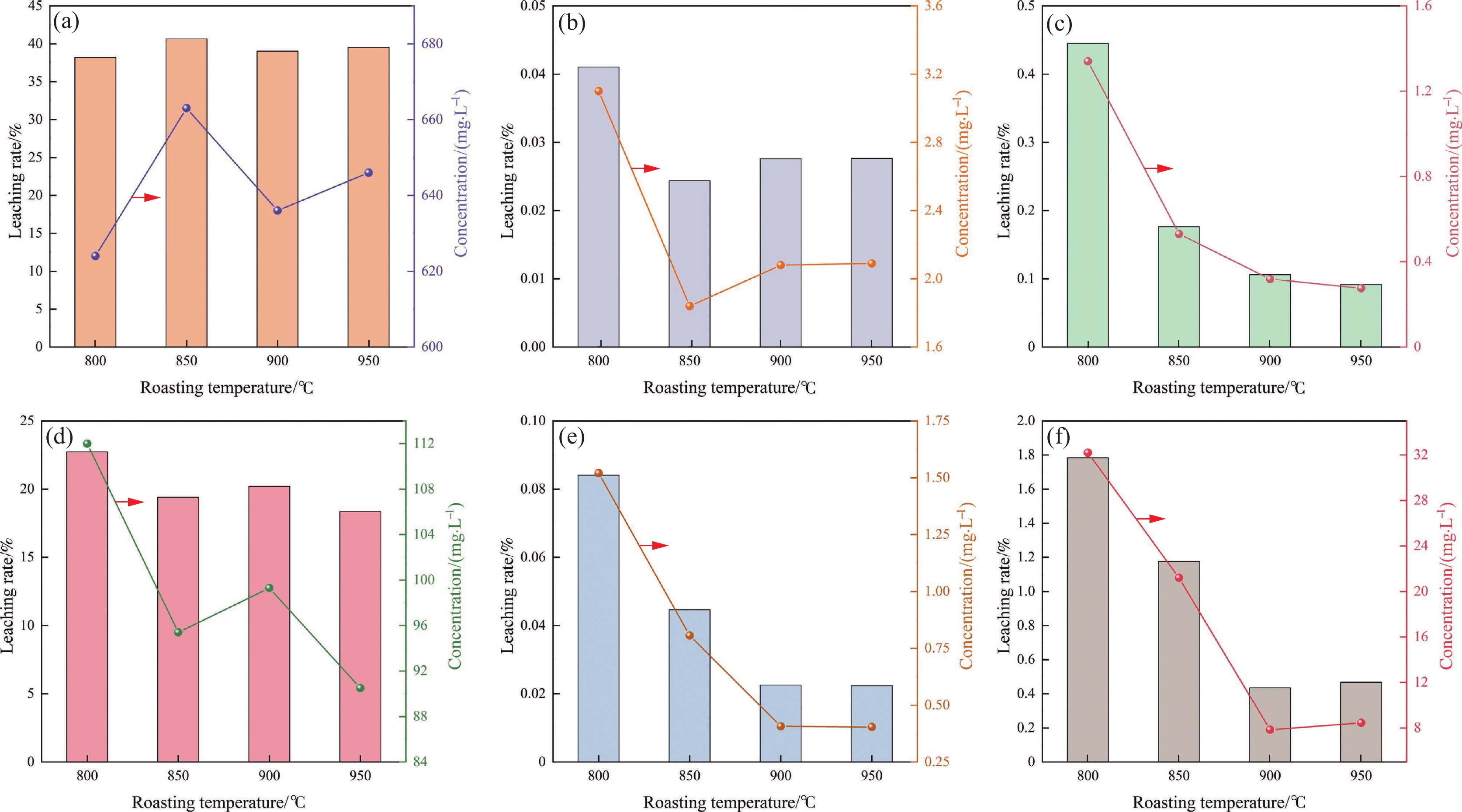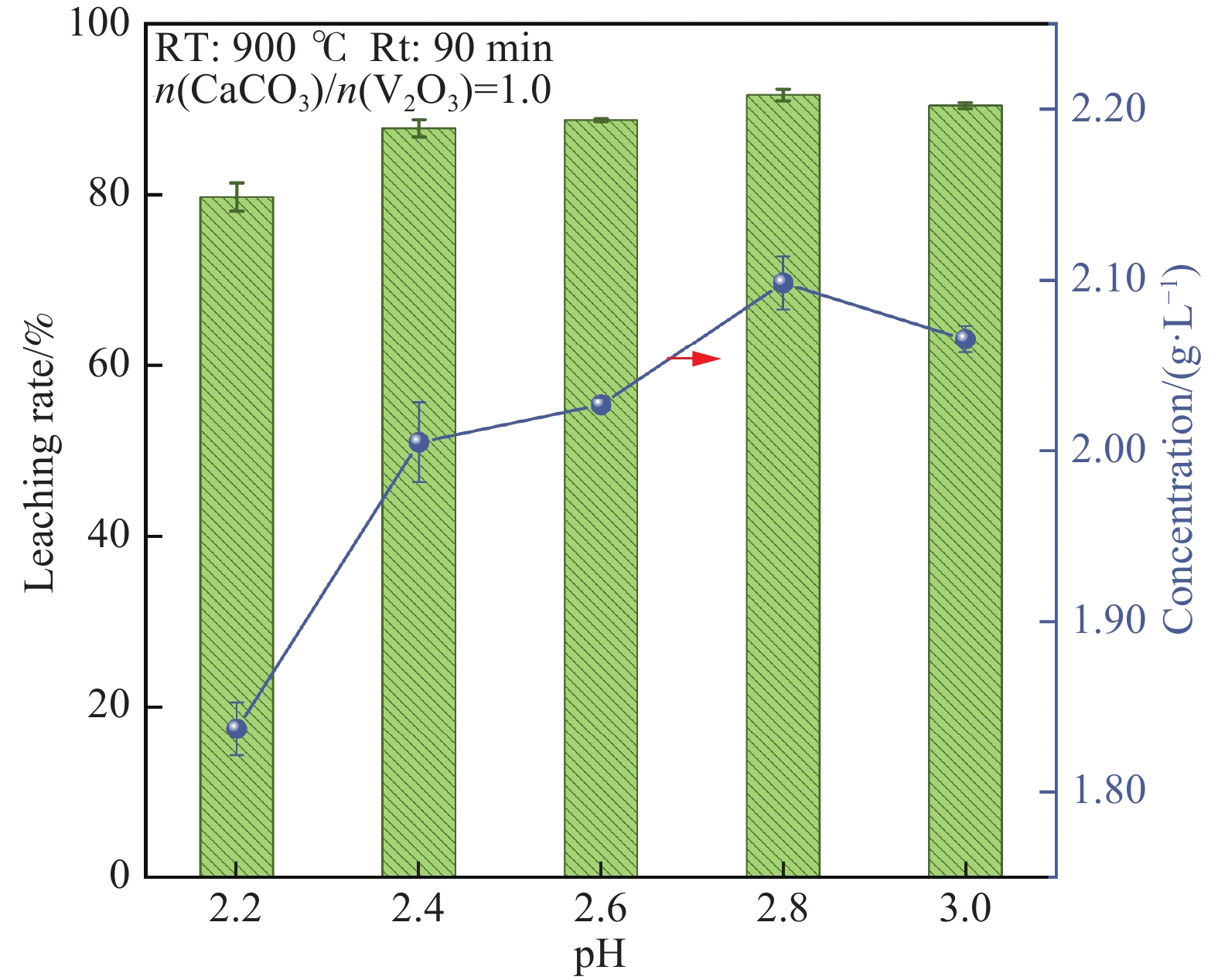 系統研究了釩渣MFe含量、焙燒過程鈣釩比和焙燒溫度、浸出pH值對V和雜質組元Mn、Fe、Cr、Mg、Ti、Si浸出行為的影響規律。研究結果表明:降低釩渣中MFe含量、鈣釩比(n(CaCO3)/n(V2O3))取1.0、焙燒溫度升高至900 ℃、浸出pH設置為2.8,V浸出率可達91.68%。Mn和Mg的浸出率變化趨勢相似,隨MFe含量增加、鈣釩比增大而降低;在焙燒溫度800~950 ℃、浸出pH值 2.2~3.0的范圍內,浸出率基本穩定,分別約38%和20%。Fe浸出率與MFe含量協同變化,高溫焙燒和高pH值可抑制其浸出;受鈣釩比影響甚微,均低于0.04%。Cr、Ti和Si浸出率均隨MFe含量增加和焙燒溫度升高而降低;Cr基本不隨鈣釩比的變化而變化,而Ti和Si隨鈣釩比增大呈升高趨勢;浸出pH值的影響各異,Si浸出率隨pH值升高而降低,而Ti反之升高,Cr浸出率穩定在0.1%左右。