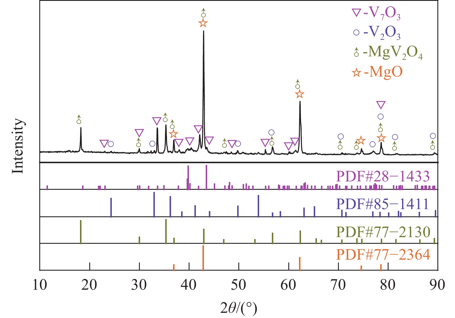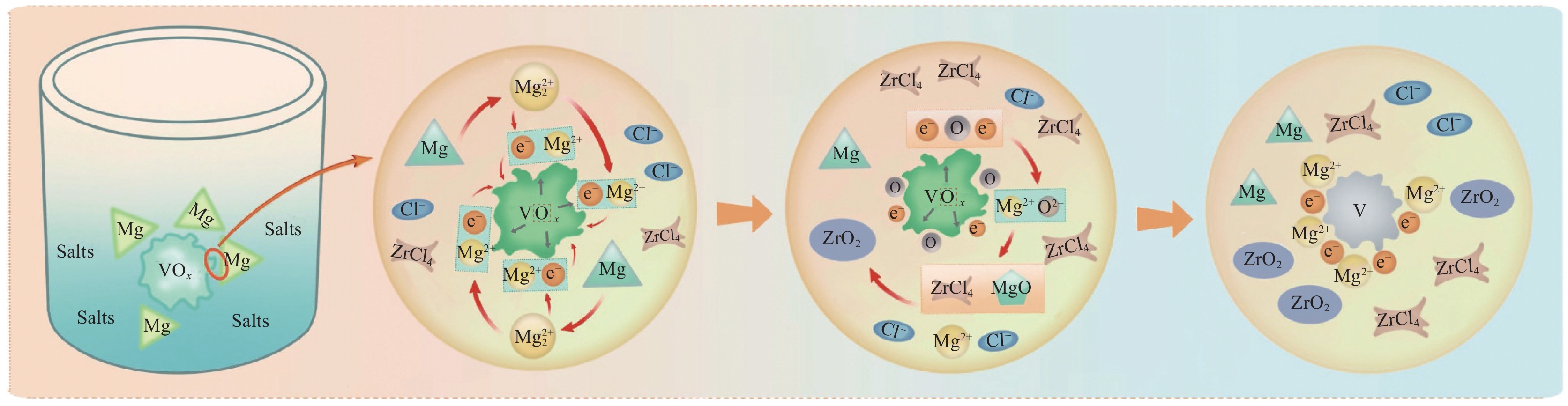 金屬熱還原法制備金屬釩存在金屬用量大、成本高和釩中氧含量高的問題。雖然鎂熱還原法在熱力學上能夠將釩中氧降低至0.01%,但在實際反應過程中,MgO/MgV2O4氧化層的形成會嚴重阻礙反應動力學過程。為此,創新性地提出“氫還原—熔鹽協同鎂熱還原”兩步法新工藝,首先通過氫還原制備低價釩氧化物(V2O3、VO)并作為鎂熱還原工藝的原料,再利用反應型ZrCl4-KCl熔鹽為介質打破氧化層包裹效應,突破動力學限制,在低溫下同步實現釩氧化物的鎂熱還原與氧化層界面凈化。經工藝參數優化(Mg添加量35%、反應時間1 h、溫度800 ℃),最終制備出O含量約為0.16%的高純金屬釩。