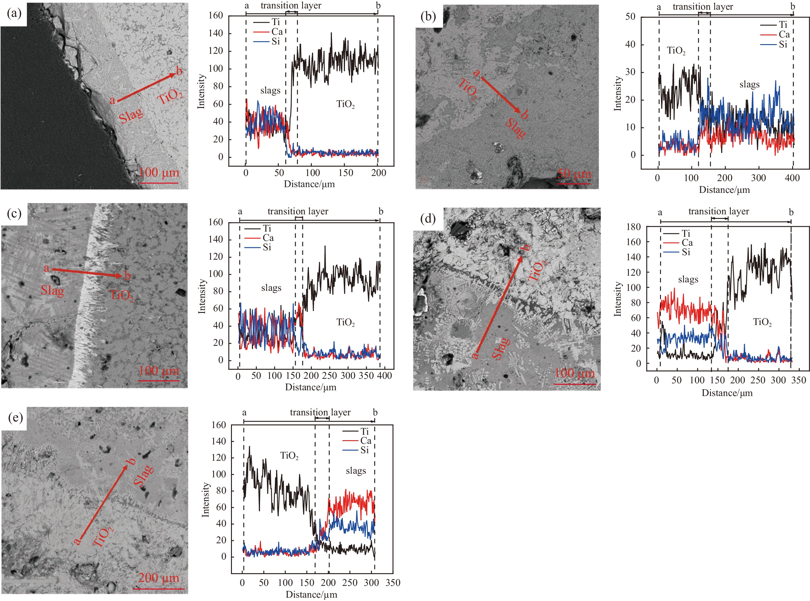 為了提高高鈦鋼連鑄過程中保護渣吸收夾雜物的速率,設計了五種潛在的高鈦鋼保護渣,將原位觀察試驗和旋轉圓柱法相結合,分別觀察和定量分析了各保護渣對TiO2夾雜物的吸收行為及吸收速率的差異,采用掃描電鏡-能譜儀(SEM-EDS)對TiO2試樣與保護渣接觸的界面進行分析,以確定TiO2在保護渣中的溶解機理。結果表明,TiO2在CaO-SiO2-BaO渣中溶解速率最快,其次為低堿度CaO-SiO2渣,兩種渣在原位試驗中耗時較短,且完全溶解,在旋轉圓柱試驗中溶解速率分別為0.285 、0.281 mm/min。TiO2在高堿度CaO-SiO2、CaO-SiO2-Al2O3和CaO-SiO2-Al2O3-BaO渣系中溶解速率較慢,僅CSAB渣完全溶解,旋轉圓柱試驗中溶解速率分別為0.151、0.101 mm/min和0.191 mm/min。阻礙TiO2溶解的主要原因是溶解的TiO2與渣中CaO反應生成的高熔點CaTiO3使得保護渣局部粘度和熔點上升。