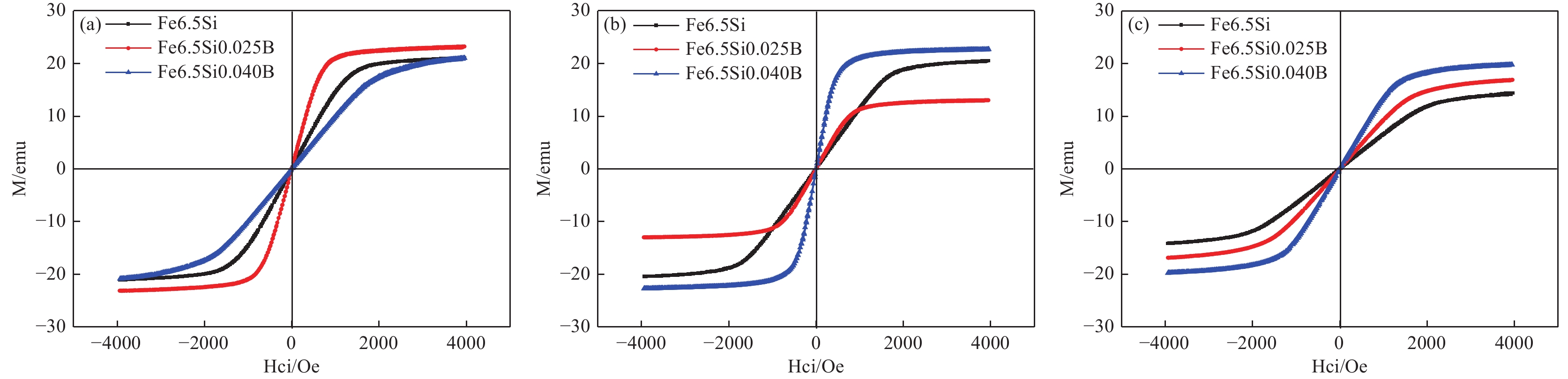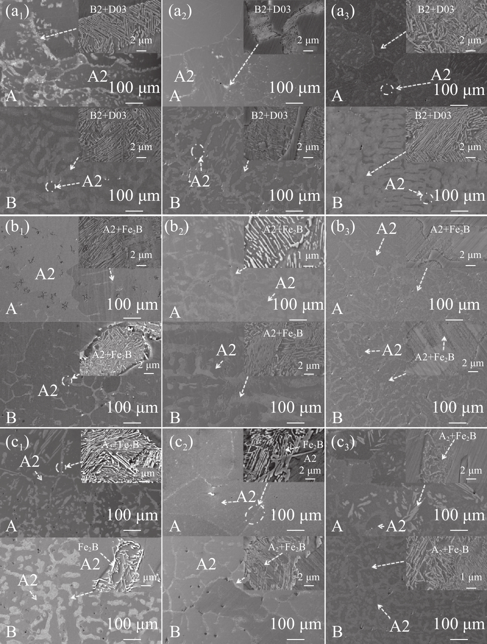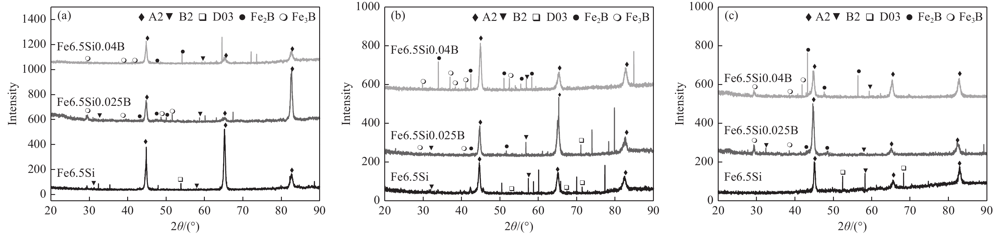 采用定向凝固技術制備Fe6.5SixB合金,研究了拉速和B含量對合金定向凝固定向退火區和初始過渡區組織演變以及力學性能和磁性能的影響。采用XRD測定合金組織結構,掃描電鏡分析合金顯微組織及相組成,高低溫振動樣品磁強計測定合金磁性能。結果表明,Fe6.5SixB合金定向退火區柱狀枝晶平行拉速方向生長,過渡區為大塊狀晶粒。Fe6.5Si合金定向退火區主要由A2相和(A2+D03)層狀組織組成,添加B后定向退火區由A2相和(A2+Fe2B)層片狀共晶組織組成。隨拉速增加Fe6.5Si合金中(B2+D03)層狀組織含量增多,Fe6.5SixB合金中(A2+Fe2B)層狀組織變細;合金應變值先增加后降低。隨B含量增加Fe6.5SixB合金磁極化強度(Js)和矯頑力呈現降低趨勢,剩磁(Jr)呈現增加趨勢,合金硬度值降低。