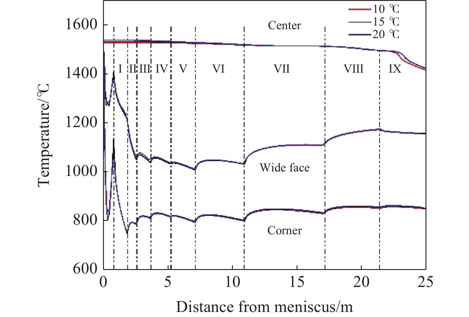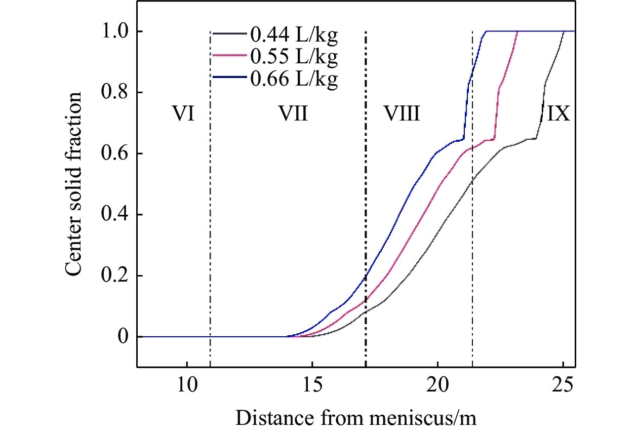為改善E355板坯連鑄坯質量,通過數值模擬的方法,對現有生產狀況進行了分析,分別研究了拉速、比水量和過熱度對鑄坯凝固過程和壓下位置的影響。根據模擬結果,得到理論上該鋼種更優的生產條件:拉速為1.1 m/min,比水量為0.66 L/kg,過熱度為10 ℃,輕壓下位置為距彎月面17.8~21.1 m,根據生產數據,壓下位置應在seg.7~9。