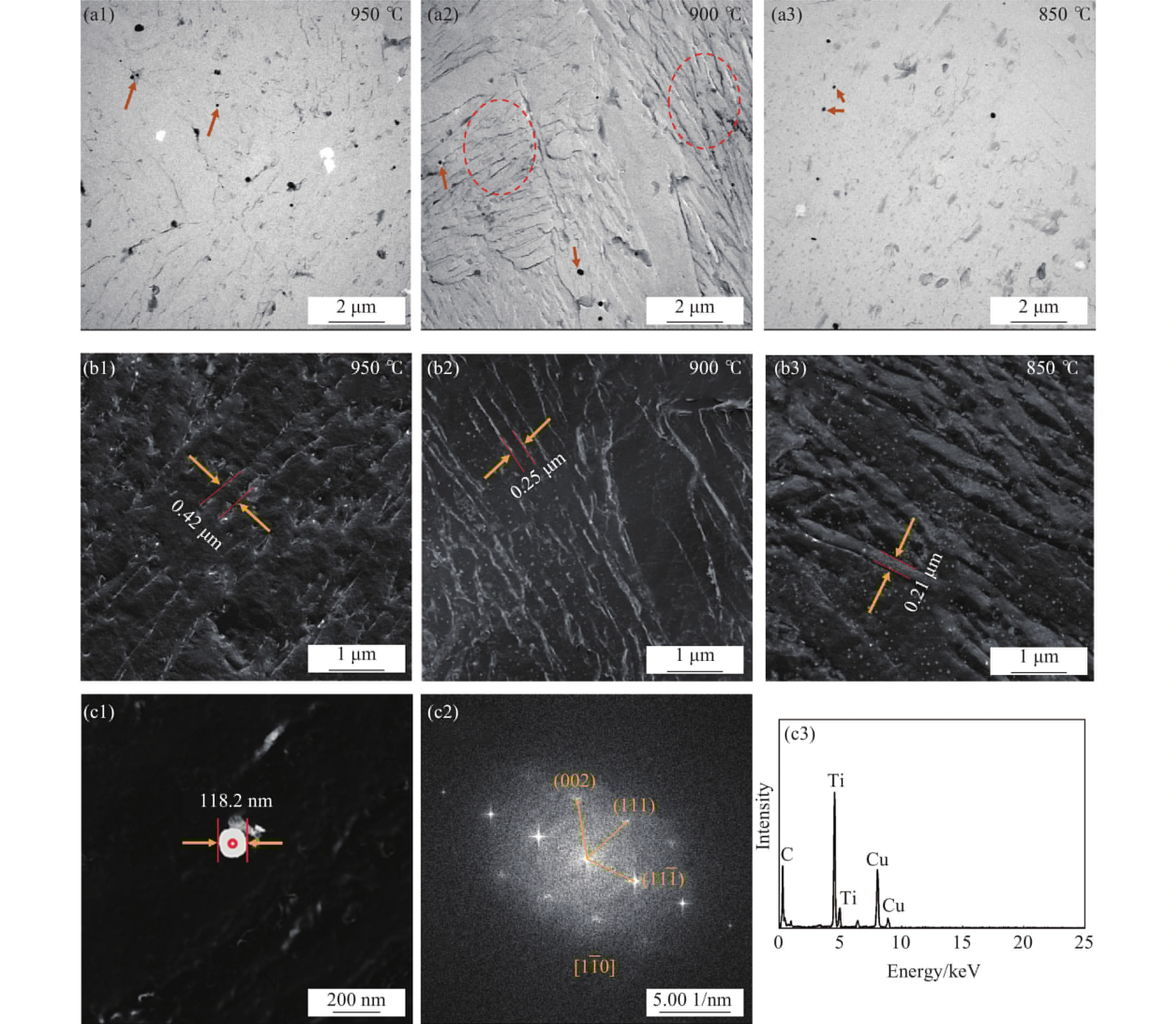 研究了含氫量對Ti-2Al-2.5Zr鈦合金微觀組織以及氫化物析出取向的影響。結果顯示,高溫氣相充氫(質量分數)0.01%、0.05%后,合金內部形成了δ-氫化物。隨著含氫量的增加,氫化物尺寸和密度逐漸增加。α-Ti/δ-氫化物具有{0001}α//{${1 \bar {1}1} $}δ, <$ {1\bar {2}10} $>α//<110>δ取向關系。氫化物析出導致的晶格膨脹會使得周邊α-Ti基體和氫化物內部形成大量的位錯,其尖端處的應力可穿過晶界,并誘導相鄰晶粒內部形成氫化物。