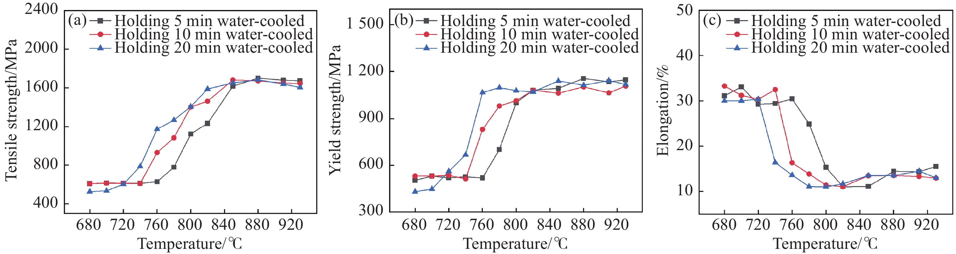 通過設計不同加熱時間和保溫時間的熱處理制度,系統研究了680~930 ℃不同溫度對22MnB5鋼淬火組織與力學性能的影響。結果表明,在低溫區(680~700 ℃)長時間受熱會導致材料軟化,高溫區(850~930 ℃)長時間受熱對力學性能提高有限;而在亞溫區(720~820 ℃)長時間受熱時,力學性能顯著提高。尤其是在820 ℃加熱20 min后淬火,抗拉強度和屈服強度分別達到1589 MPa和1078 MPa,較原始狀態分別提升151.02%和132.82%。研究表明,通過優化亞溫區加熱制度,22MnB5鋼可以在低于現有工藝溫度下獲得1500 MPa級別的抗拉強度,為解決現有熱成形工藝問題提供了新途徑。
