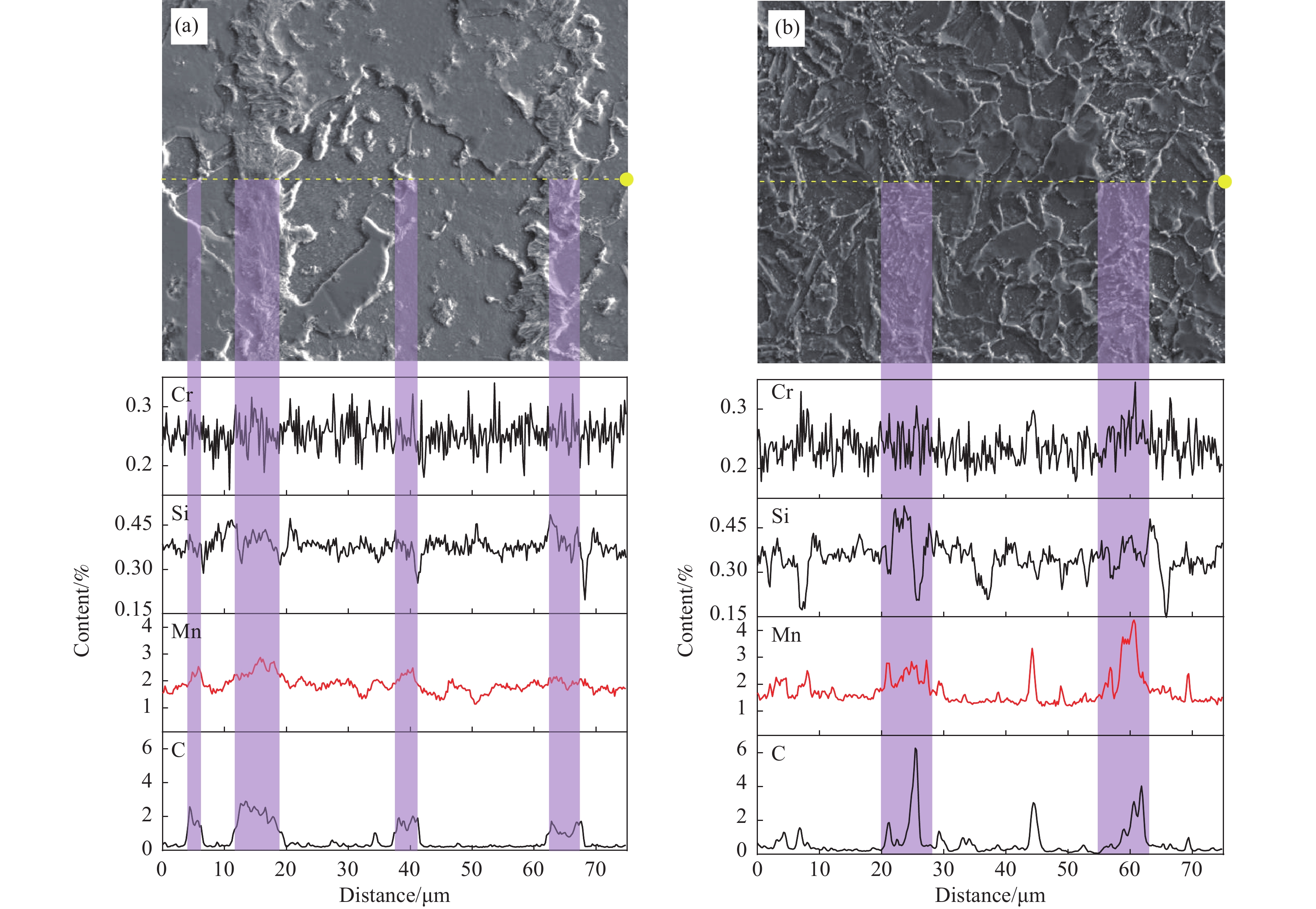 深入探究了軋后調質處理(890 ℃淬火+710 ℃回火)對熱軋Q345R鋼中元素偏析及其引發的帶狀組織的調控作用與機制。結果表明:熱軋Q345R鋼由再結晶鐵素體和珠光體組成,珠光體呈帶狀分布,鐵素體晶界及晶內的珠光體呈顆粒狀分布;經過軋后調質處理的Q345R鋼基體組織為回火馬氏體,且內部存在少量再結晶馬氏體,回火馬氏體中富C富Mn區域存在滲碳體密集析出帶。熱軋和軋后調質處理Q345R鋼中均存在顯著的C、Mn元素偏析,且帶狀組織(珠光體帶或滲碳體析出帶)均與元素偏析帶高度重合。軋后調質處理雖未消除凝固遺留的元素偏析,但通過馬氏體相變有效打破了固態相變對原始元素分布的高度依賴性,顯著調控了帶狀組織的形成模式與特征,并將帶狀組織等級從5B降低至3B;同時,將軟硬相強度差值從206.76 MPa調控降低至119.48 MPa,有效改善了因帶狀組織導致的力學性能不均勻性。