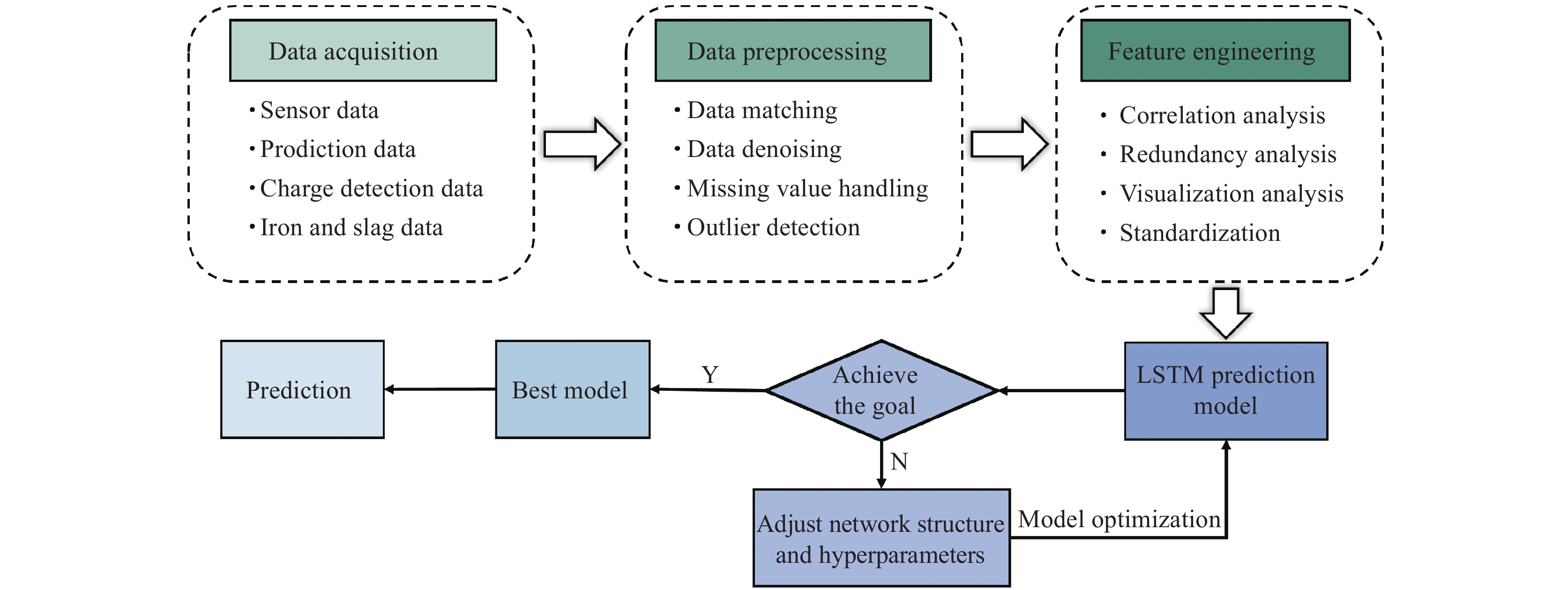 Aiming at the problems of high parameter dimension, strong feature redundancy and weak correlation between target variables and features in hot metal KR desulfurization production process, an integrated feature selection method IMFS (Feature selection based on importance measure) based on importance measure is proposed. In the filtering pre-screening stage, the maximal mutual information coefficient ( MIC ) is used to measure the correlation between each parameter and the target variable, as well as the redundancy among each parameter, and the scale of candidate parameters is reduced according to the maximum relevance and minimal redundancy criteria. In the embedded selection stage, the LightGBM algorithm is introduced as the supporting model for quantifying information contribution and data sensitivity, and the entropy weight method is used to weight and fuse the dual measurement results. Finally, according to the feature importance coefficient, the feature subset is optimized by combining the GBT sequential forward search strategy. The experimental results show that compared with other methods, IMFS has significant advantages in eliminating redundant features and improving prediction accuracy, and can effectively balance the number of features and prediction accuracy.