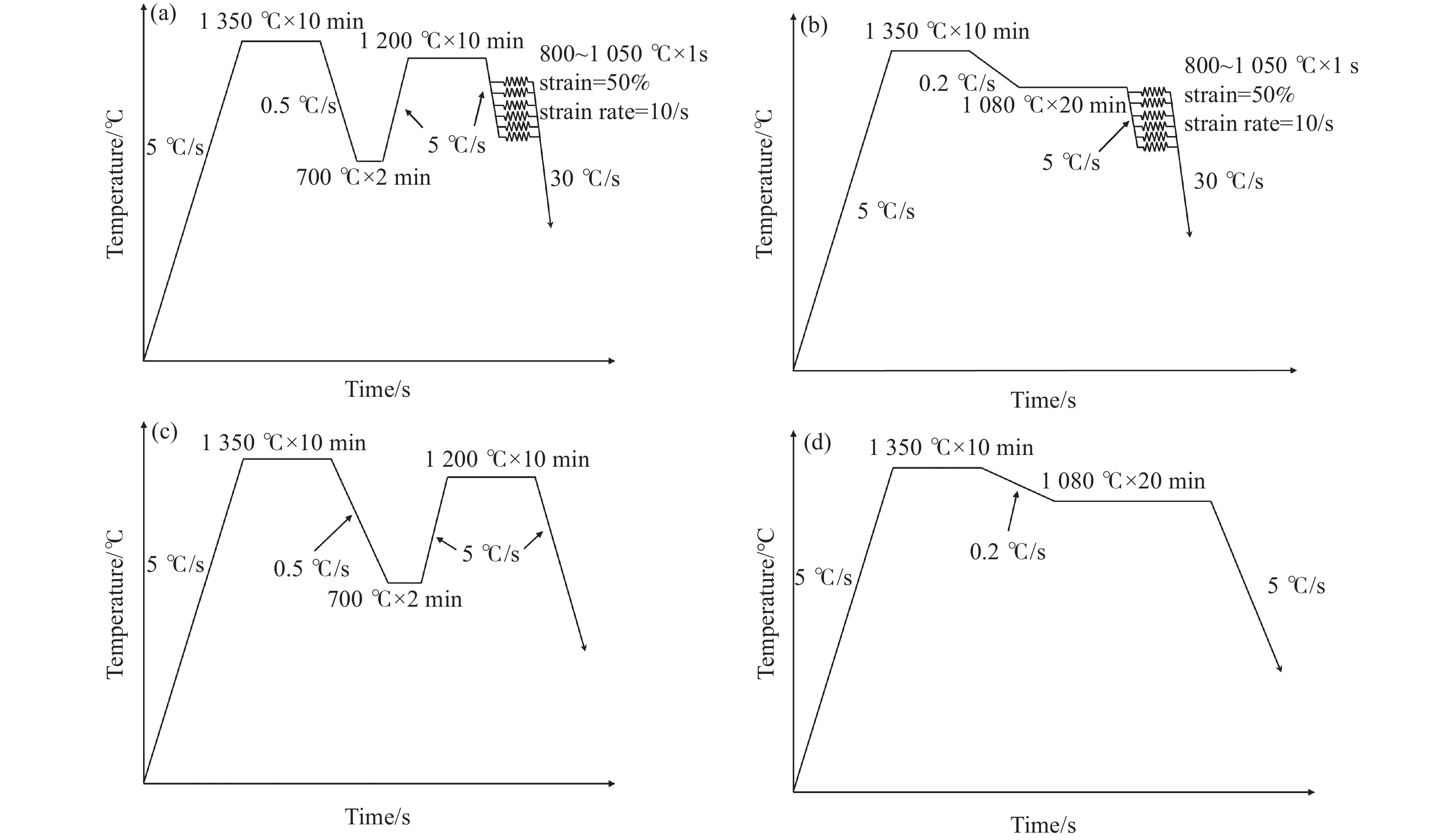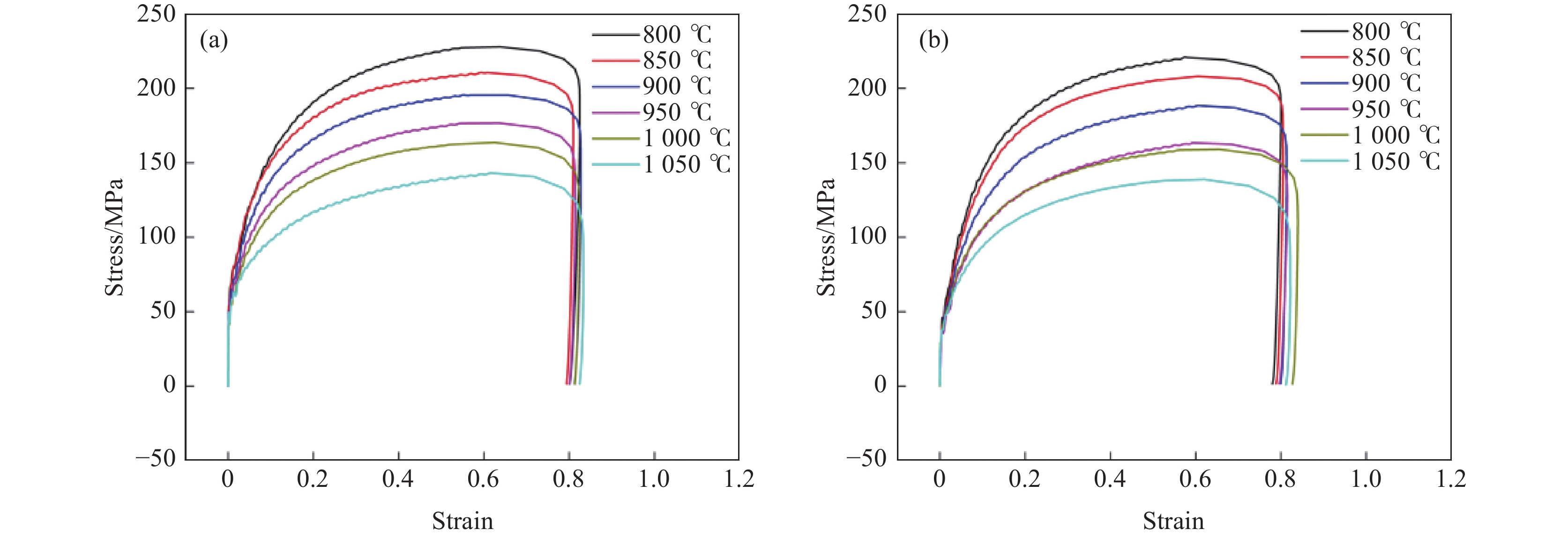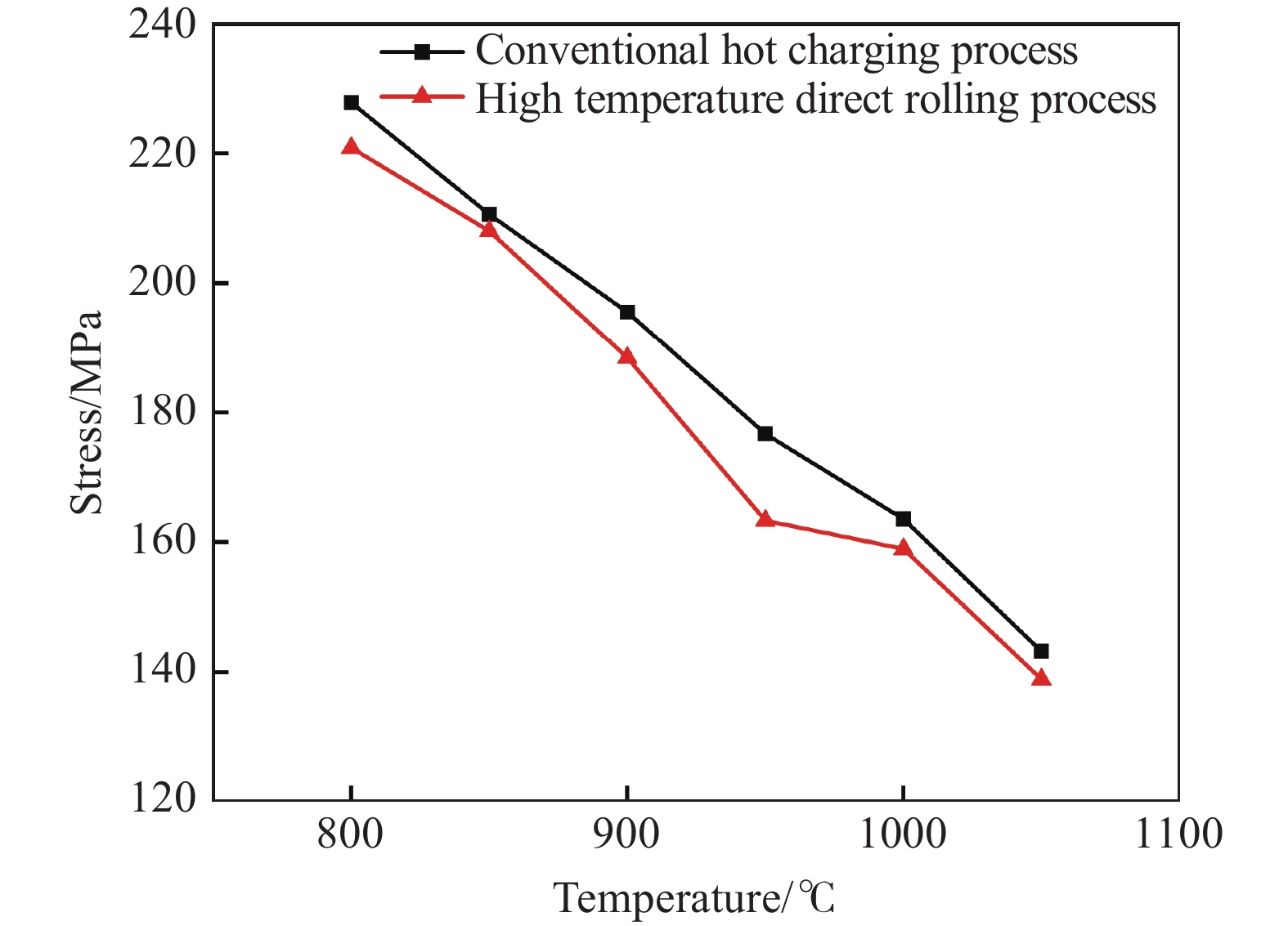 The deformation resistance of metals during deformation is influenced by various factors. Among them, the deformation temperature, deformation process, and strain-induced phase transformation all have an impact on the deformation resistance. This article focuses on low carbon micro-Nb steel and conducts thermal compression experiments using a Gleeble-3500 thermal simulation testing machine. Simultaneously, the in-situ high-temperature morphology under conventional hot charging and high-temperature direct rolling was observed by high-temperature laser confocal microscope. The results show that as the deformation temperature increases from 800 ℃ to 1050 ℃, the maximum deformation resistance during high-temperature direct rolling decreases from 220.9 MPa to 138.9 MPa, while the maximum deformation resistance under the conventional hot charging process decreases from 227.9 MPa to 143.8 MPa. It is mainly because when the deformation temperature gradually increases, the thermal activation energy is enhanced, and the movement of dislocation becomes easier, which leads to a decrease in the deformation resistance. In addition, when the deformation temperature is the same, the deformation resistance of the conventional hot charging process is larger than that of the high-temperature direct rolling process. It is due to the original austenite grain size under the conventional hot charging process (98.7 μm) is smaller than that under the high-temperature direct rolling process (107.0 μm). During the cooling process before reheating in the conventional hot charging process, a ferrite phase transformation occurs, and austenitization occurs again after reheating, making the newly formed austenite grains smaller than the original austenite grains. Therefore, the smaller original austenite grain size under the conventional hot charging process leads to the stronger fine-grain strengthening effect, resulting in greater deformation resistance. Additionally, the experimental data of deformation resistance under different rolling processes were fitted and corrected by using the deformation resistance models proposed by Guan Kezhi and Zhou Jihua, and a deformation resistance prediction model for the tested steel during high-temperature deformation was established. The coefficient of determination R2 of the models for the conventional hot charging process and the high-temperature direct rolling process reaches 0.9865 and 0.9826 respectively, indicating a high fitting accuracy between the model's predictions and the experimental results.