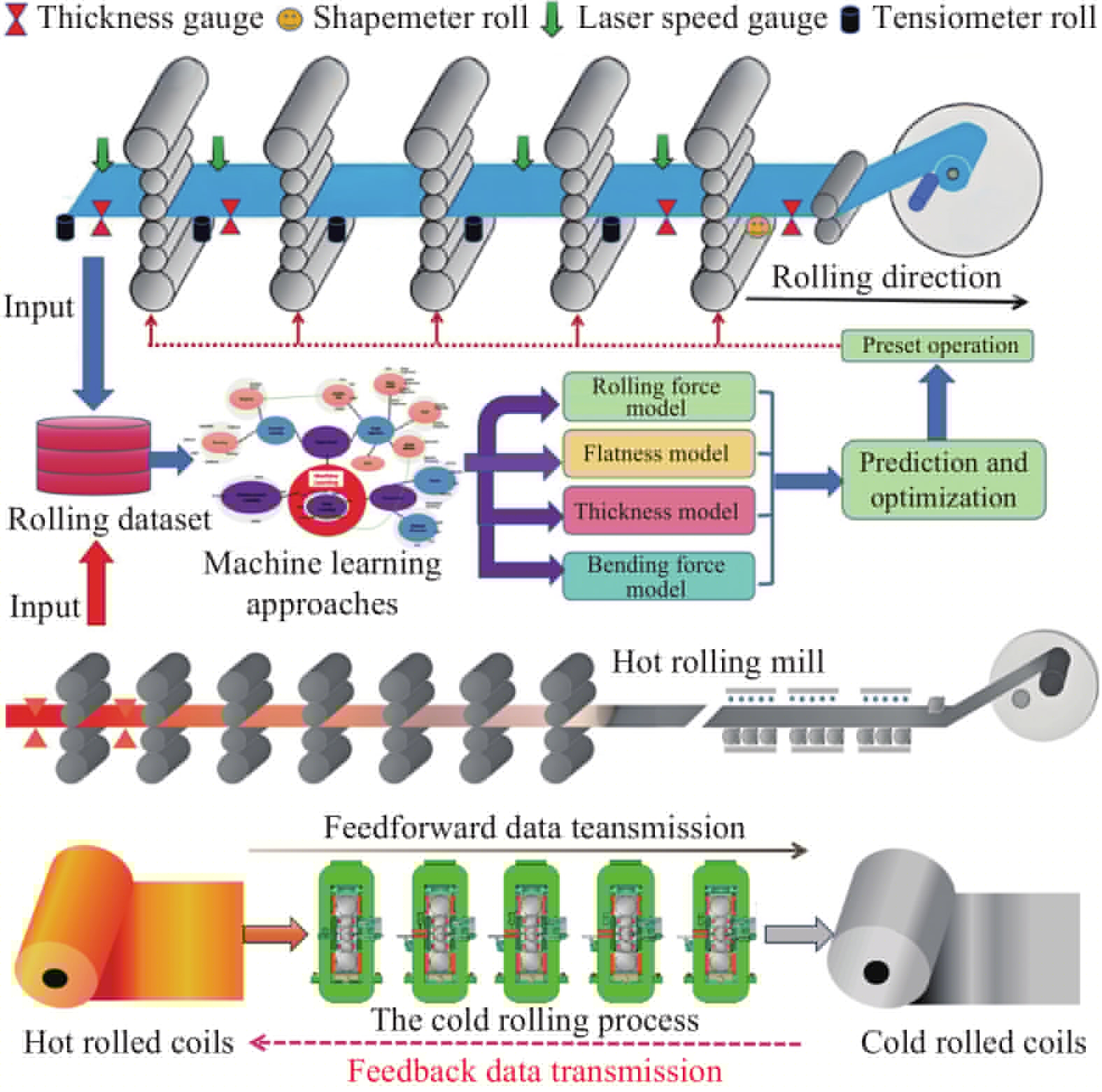 The strip cold rolling process is a critical component of iron and steel manufacturing, yet it is often plagued by challenges such as flatness defects, thickness variations, and rolling mill vibrations, which can significantly impact productivity and product quality. Machine learning (ML) has emerged as a powerful tool to address these issues by analyzing vast amounts of process data to predict and mitigate potential defects in real-time. By leveraging historical and real-time data, ML algorithms can identify complex patterns and correlations between operational parameters (such as roll force, roll gap, and rolling speed)and key quality indicators like flatness and thickness uniformity. This enables the optimization of process parameters dynamically, ensuring consistent product quality while minimizing waste and downtime. Furthermore, ML-driven predictive models facilitate proactive adjustments to the rolling process, reducing the occurrence of defects and enhancing the overall efficiency. The integration of ML not only improves the precision and reliability of the cold rolling process but also leads to substantial cost savings and increased productivity.