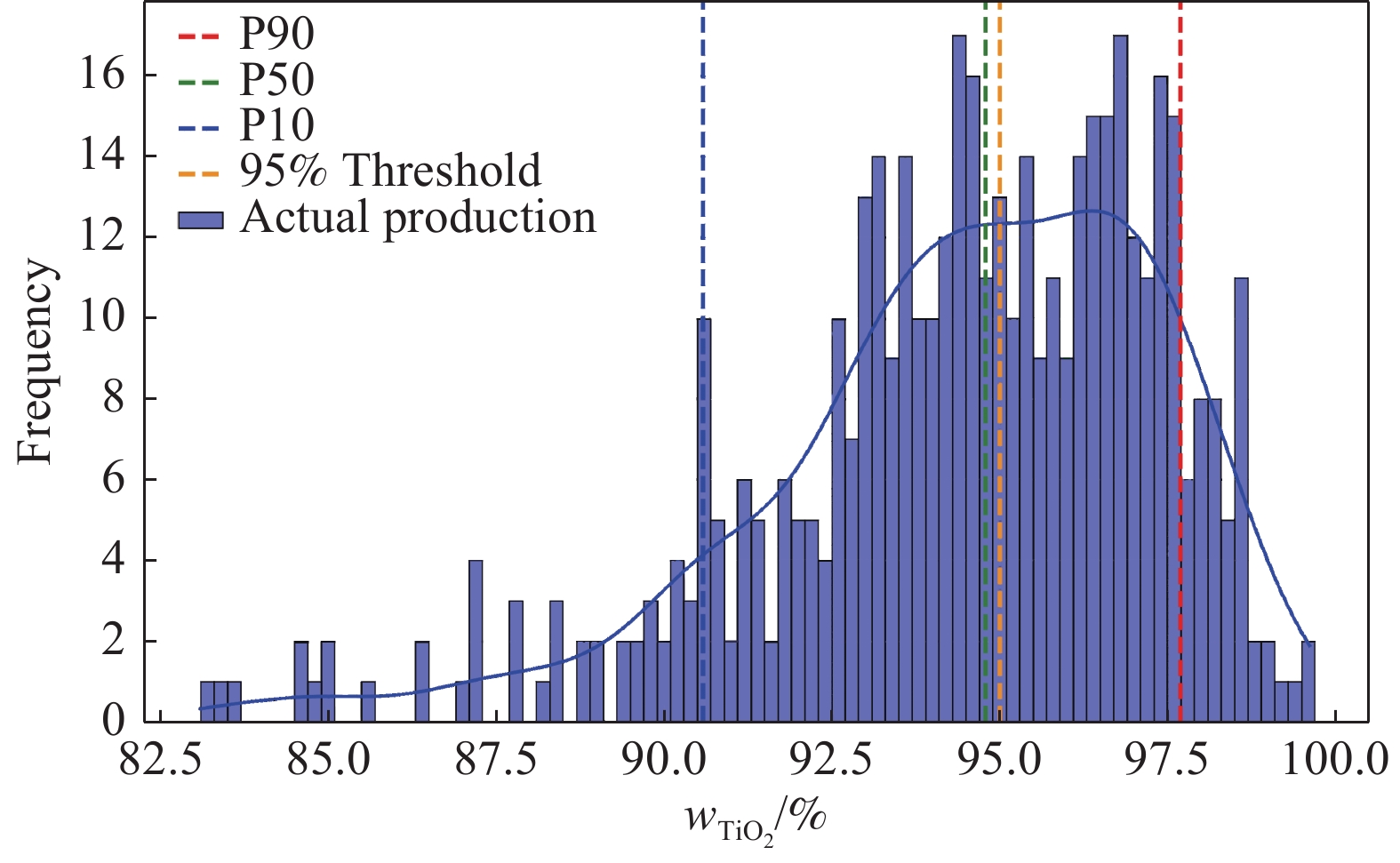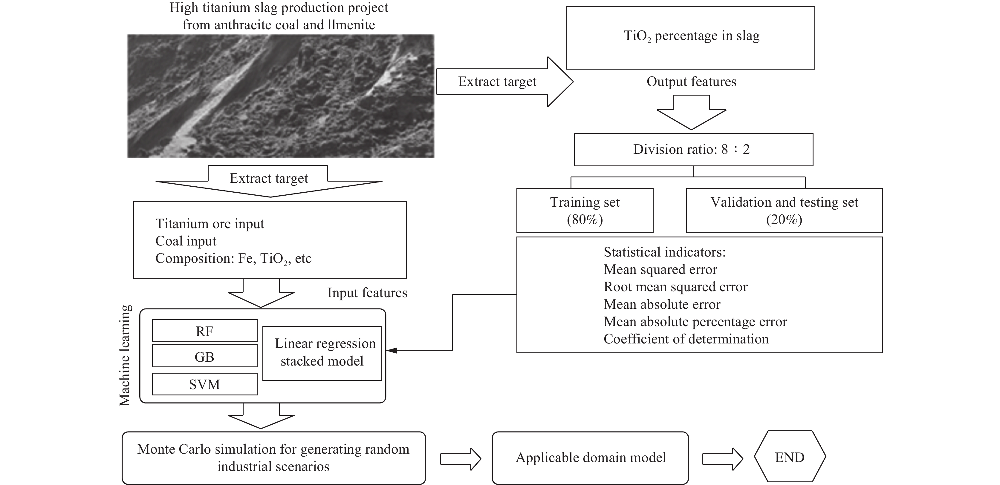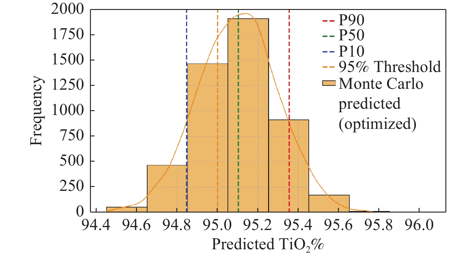 Titanium dioxide (TiO2), the primary component of high-titanium slag, is widely used in various industrial fields such as coatings, plastics, papermaking, and cosmetics. This paper proposed a TiO2 grade prediction method based on a stacked model that combines random forest (RF), gradient boosting machine (GBM), and support vector regression (SVR) to optimize the prediction accuracy of TiO2 grade in high-titanium slag through ensemble learning. The dataset was obtained from raw production data in a metallurgical plant. After data processing and feature derivation, dimensionality reduction techniques were applied to reduce the number of feature variables from 33 to 15, thereby identifying the most informative variables. Experimental results demonstrate that the stacked regression model achieves excellent performance on the validation and test sets, with an R2 value of 0.9249, MAPE values of 0.29% and 0.30%, and MSE values of 0.177 and 0.182, respectively—outperforming individual models. SHAP value analysis further revealed that feature variables such as the TiO2/FeO mass ratio and C content positively influence the TiO2 grade within certain ranges. Moreover, by integrating the stacked model with Monte Carlo simulations, the optimal ranges of key feature variables were determined, such as the TiO2/FeO ratio (1.70–2.12) and the TiO2/C ratio (0.50–0.58). This approach avoids the trial-and-error process and energy waste associated with traditional empirical methods, thereby contributing to energy conservation and emission reduction while enhancing the production efficiency and product quality of titanium slag.