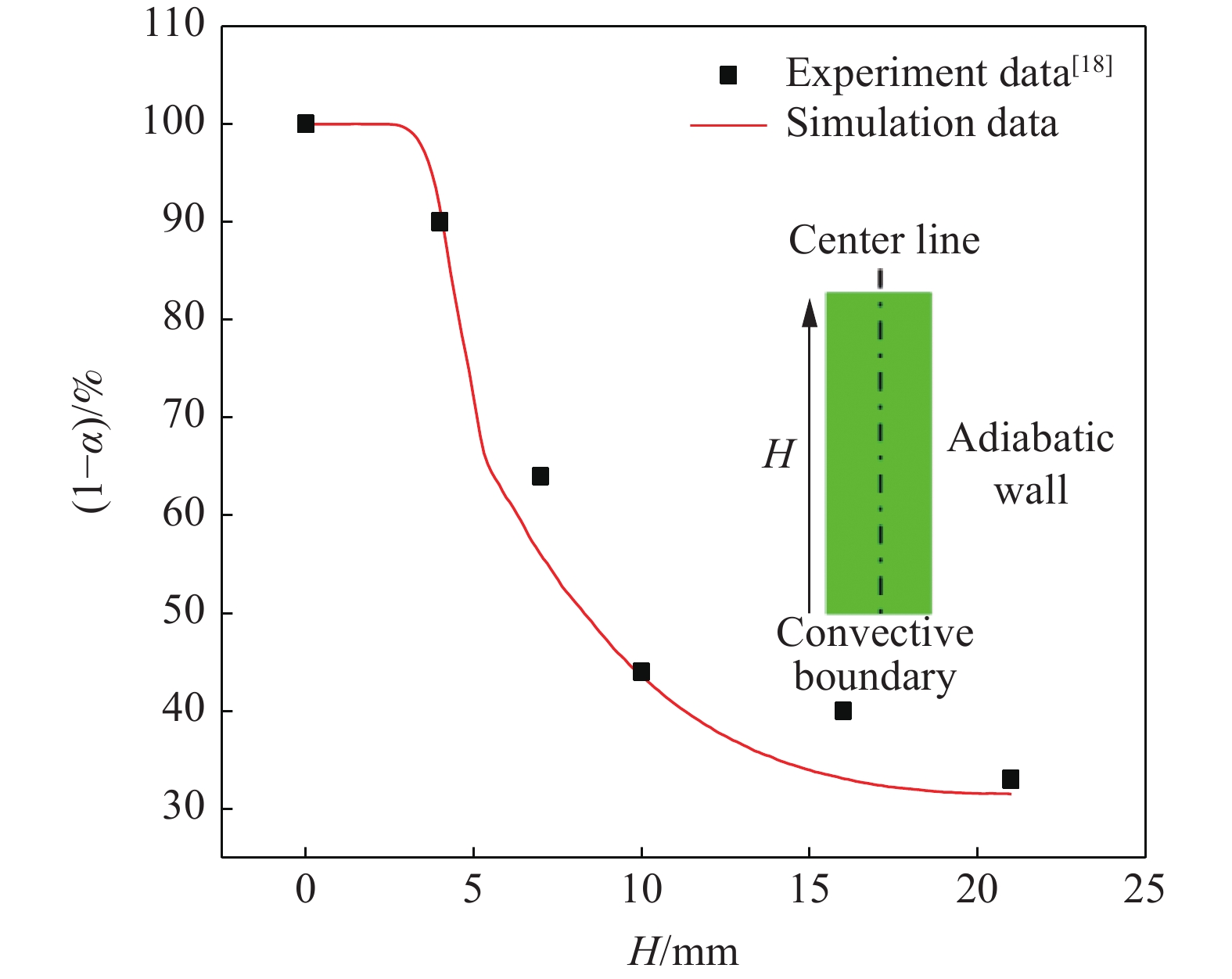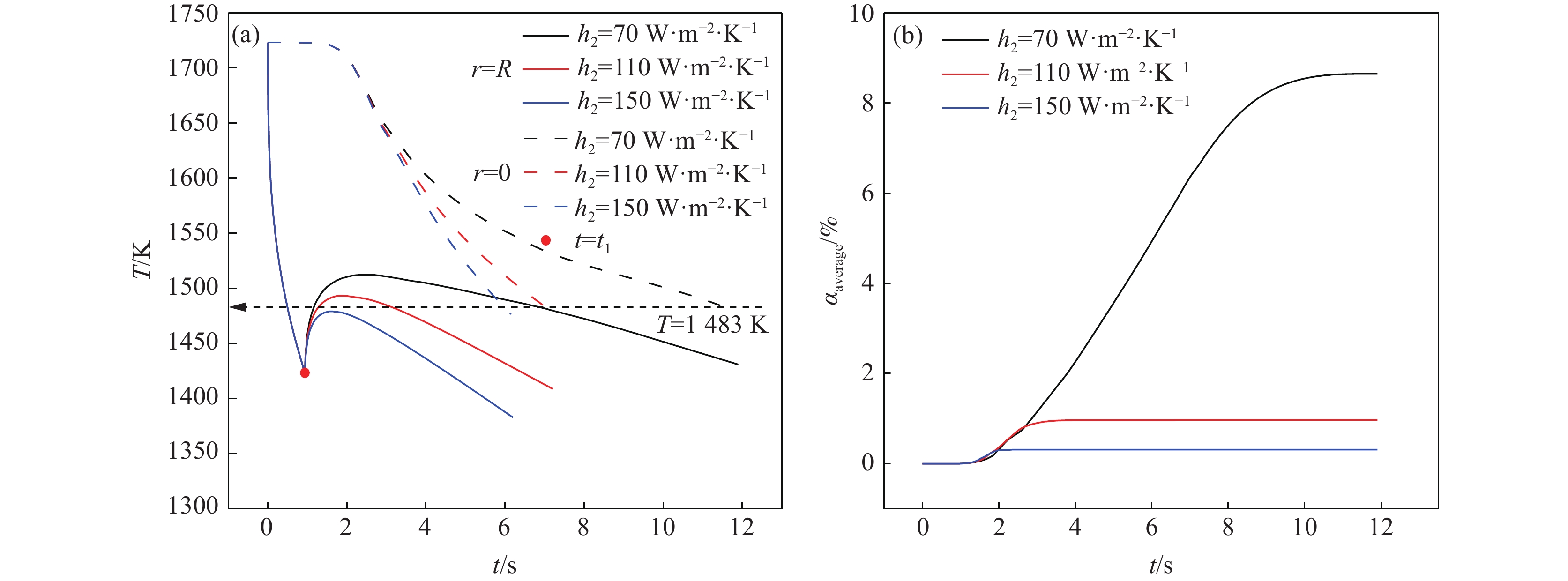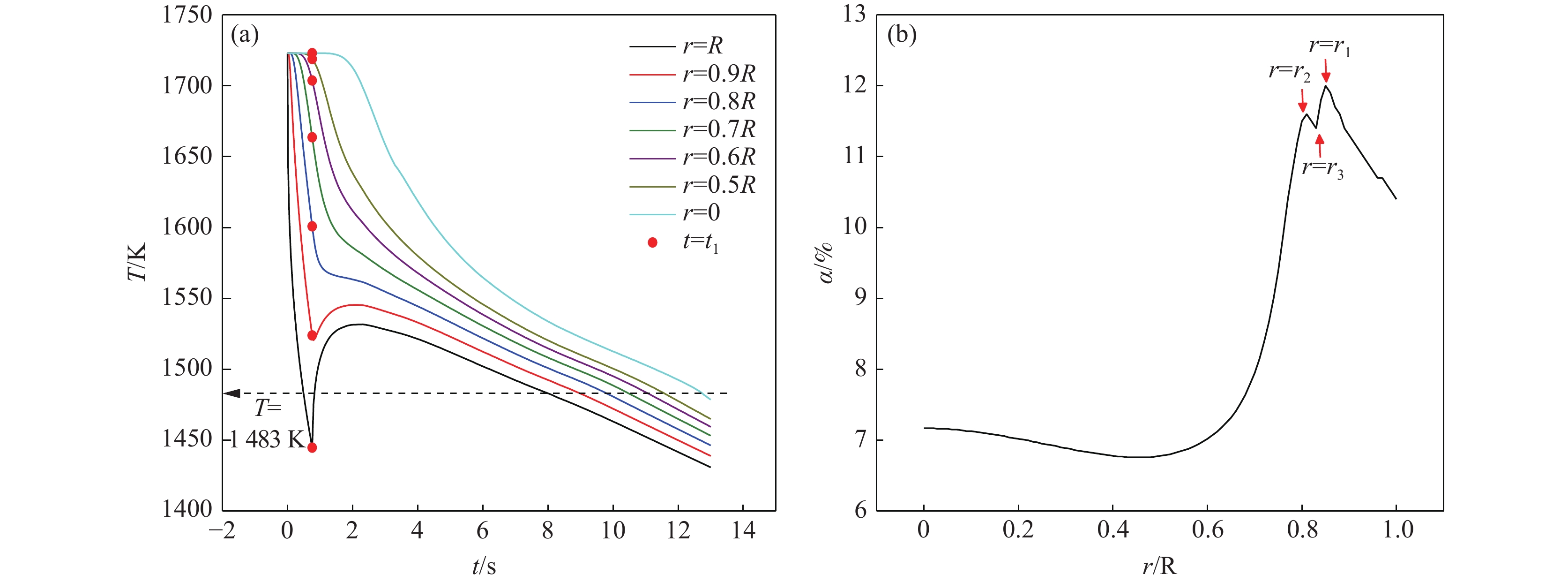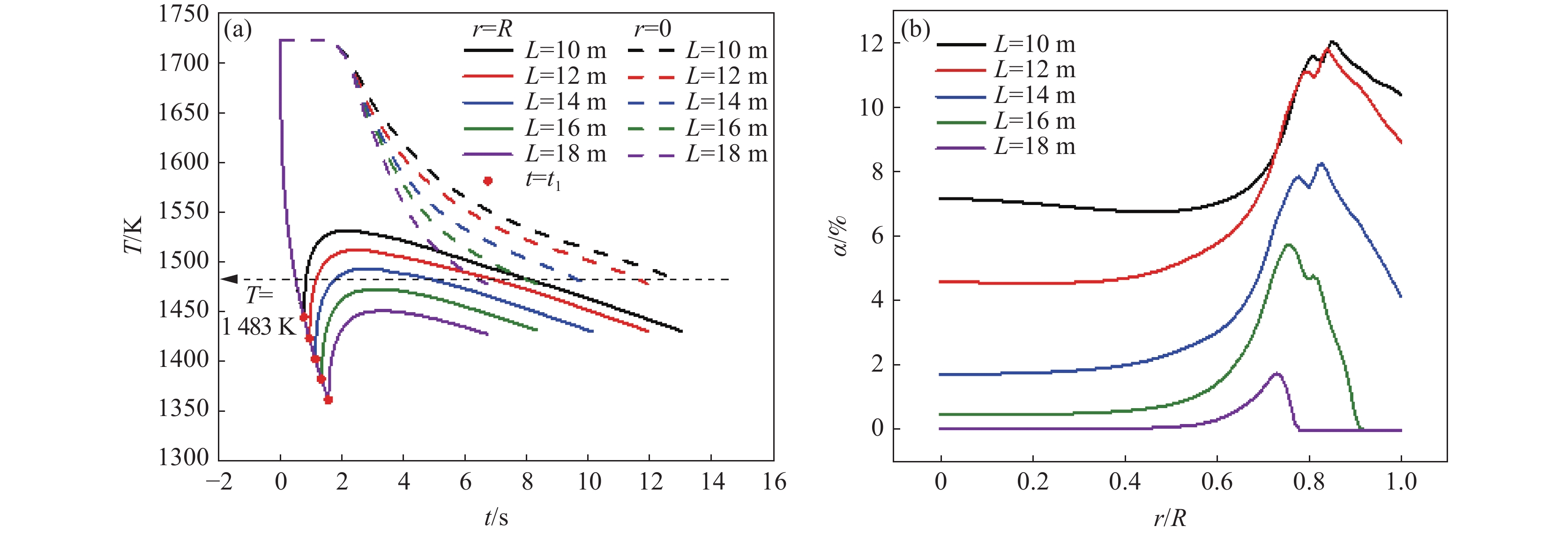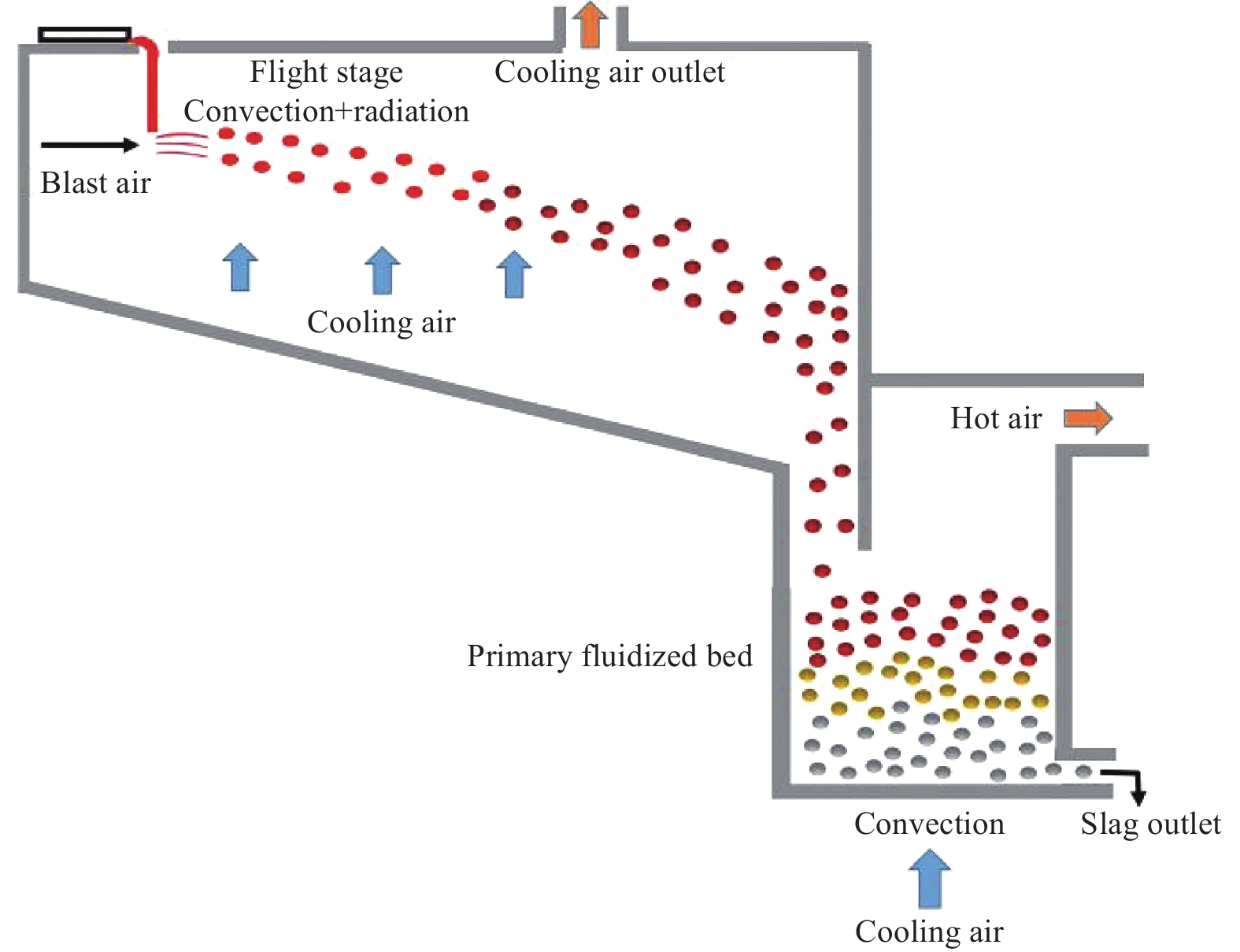 The crystallization behavior of granulated blast furnace slag droplets during cooling reduces their commercial value. In order to investigate the solidification characteristics of droplets under varying cooling conditions, a numerical simulation of the continuous solidification process was performed by integrating a droplet flight model with an enthalpy-based slag crystallization model. The results show that an increase in droplet size leads to a significant increase in the distance required for surface crust formation, and also results in an increase in the average crystalline phase content after cooling. Droplet size becomes a key factor governing solidification behavior and crystalline phase growth by influencing internal heat conduction rates and cooling uniformity. A 5-mm molten droplet at 15 m/s initial velocity requires 16 m horizontal flight to avoid remelting during cooling; increasing the primary fluidized bed convective heat transfer coefficient from 70 W·m?2·K?1 to 150 W·m?2·K?1 shortens this distance to 12 m. Two-stage molten droplet cooling must be matched: extending flight distance during surface crust formation reduces bed cooling intensity requirements, while increasing bed cooling intensity decreases granulation device size.