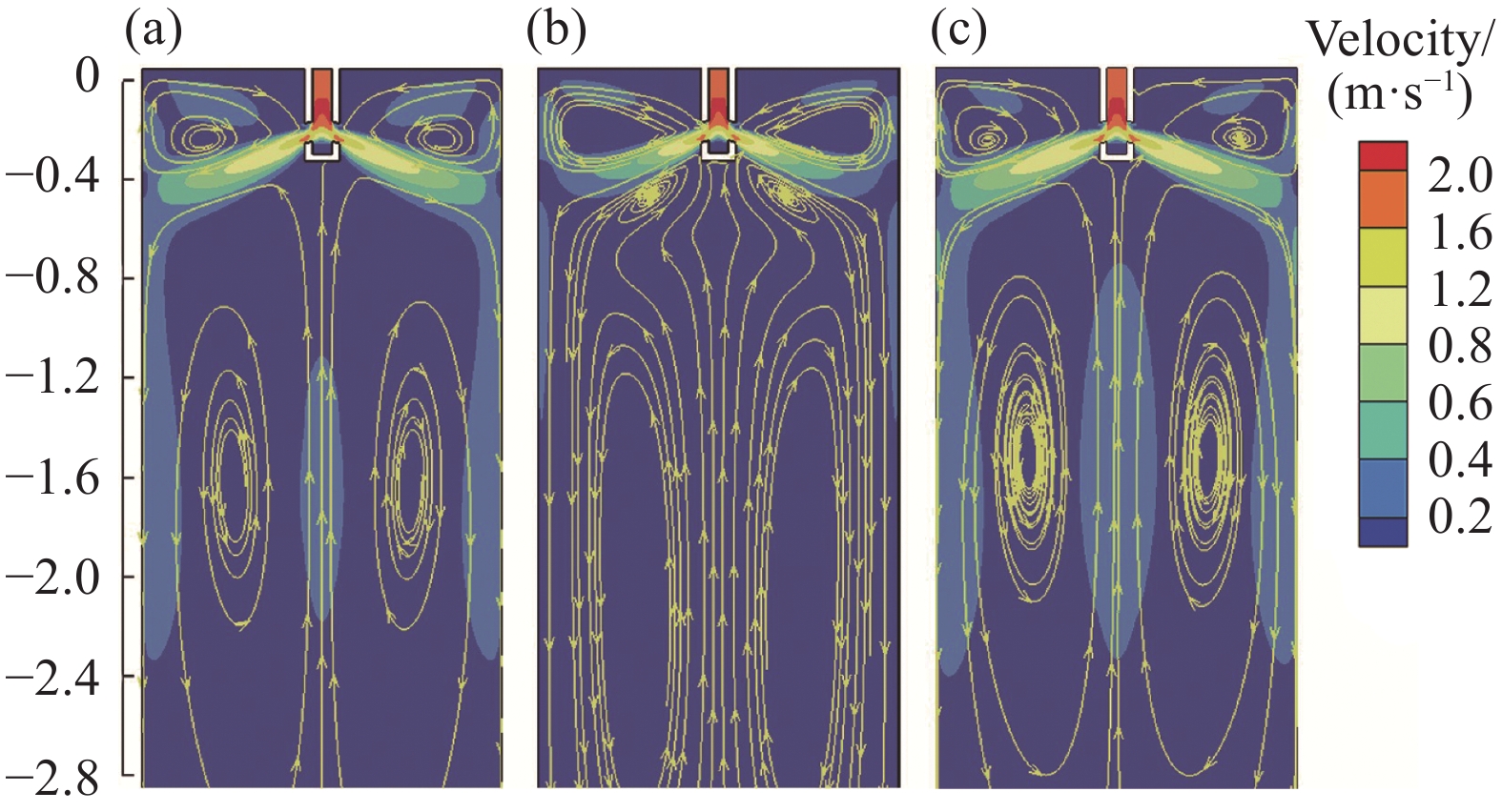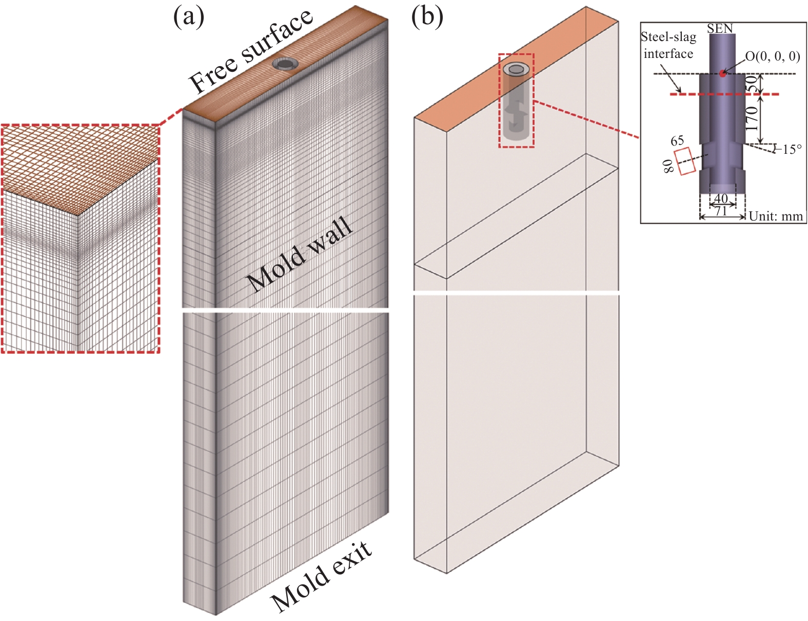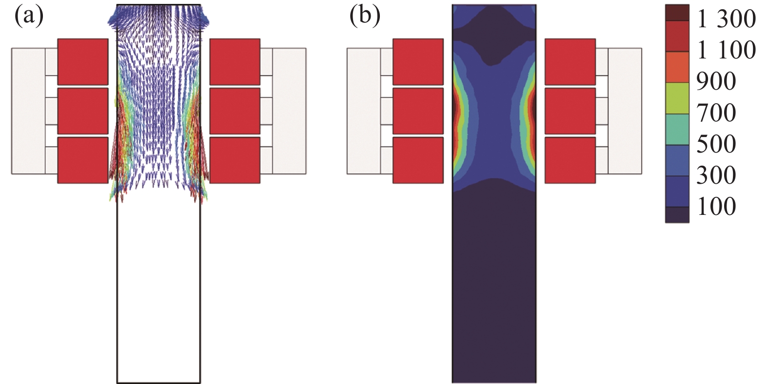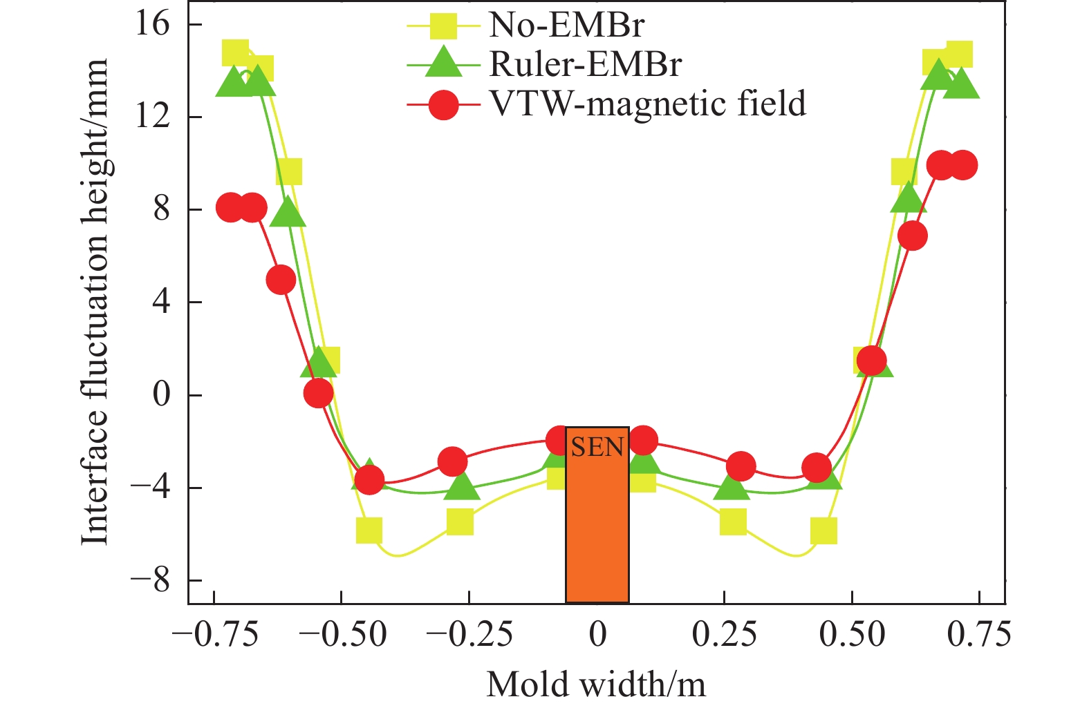 With the trend of green and low carbon development, the contemporary metallurgical industry pursues high-speed and high-efficiency continuous casting to promote sustainable development. In view of this, a vertical traveling wave magnetic field flow control technology is proposed to optimize and control the flow behavior of liquid metal during continuous casting and overcome the existing technical limitations. The proposed flow control technology can provide theoretical basis and technical support for the green and low-carbon transformation of continuous casting process. In the current research, a 1450 mm × 230 mm continuous casting slab mold is taken as a research object. Firstly, a three-dimensional multi-physical field coupling mathematical model is established for describing the electromagnetic continuous casting process. Secondly, the behaviors of molten steel flow and the steel-slag interface within the slab continuous casting mold under conditions of free magnetic field, vertical traveling wave magnetic field, and single ruler horizontal direct current magnetic field are simulated and investigated. Finally, the effects of these two magnetic field forms on the flow control of molten steel in the mold are compared and evaluated. The results indicate that, in the absence of the magnetic field, the maximum height of the steel-slag interface is 22.3 mm. When applied the current via the single ruler horizontal electromagnetic brake is 1350 A, the maximum height decreases to 18.6 mm. In comparison, when the vertical traveling wave magnetic field reducer applies a current of only 600 A, the maximum height of the steel-slag interface is significantly decreased to 13.9 mm. Based on the results, it can be concluded that the vertical traveling wave magnetic field reducer has more significant flow control advantages than the single ruler horizontal electromagnetic brake with lower energy consumption. The directional electromagnetic force generated by the vertical traveling wave magnetic field can effectively suppress the flow of molten steel in the upper recirculation zone of the mold and stabilize the fluctuation of the steel-slag interface.