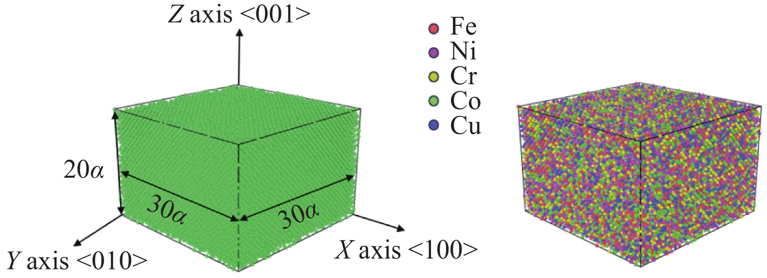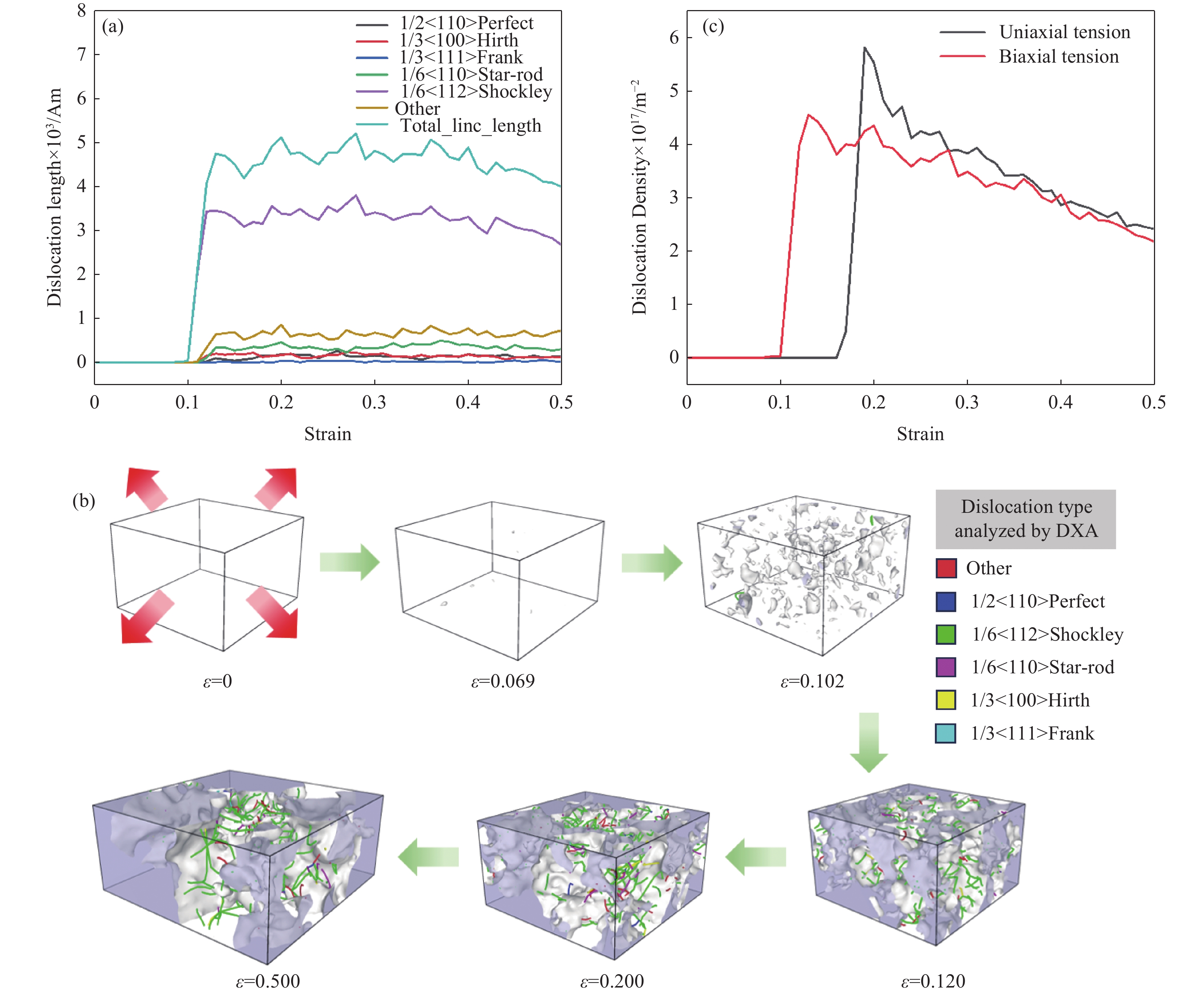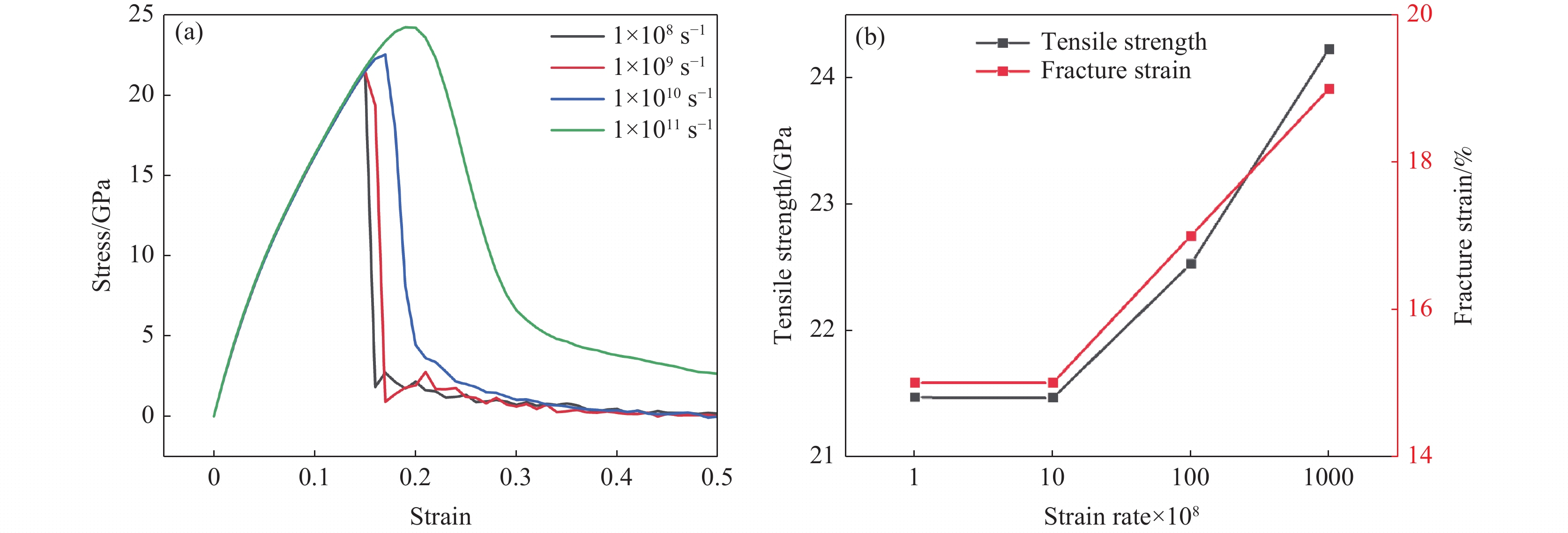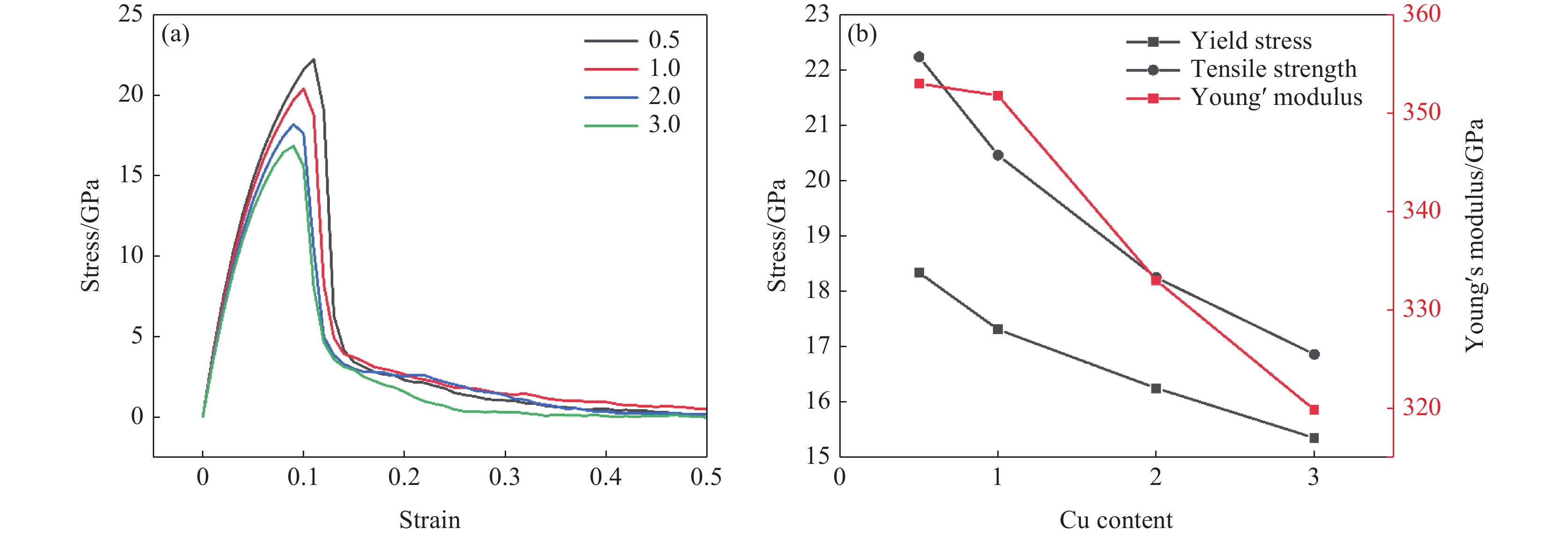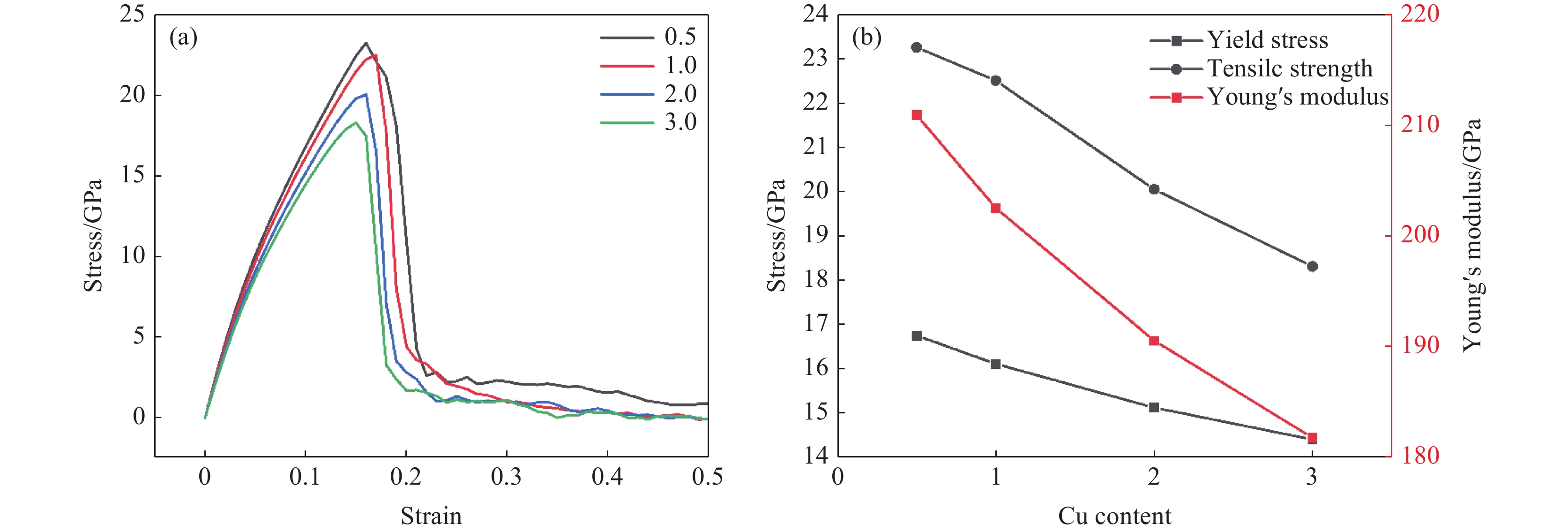 Using molecular dynamics (MD) simulations, the biaxial tensile behavior of CoCrFeNiCux (x=0.5, 1.0, 2.0, and 3.0) high-entropy alloys at different strain rates was simulated. The effects of copper content and strain rate on the biaxial tensile stress-strain behavior and the microscopic deformation mechanisms were analyzed. The results indicated that during the biaxial tensile process of CoCrFeNiCux high-entropy alloys, the face-centered cubic (FCC) structure and irregular atomic structure can transform into each other. As the Cu content increases, the Young's modulus, yield strength, and ultimate tensile strength of CoCrFeNiCux high-entropy alloys decrease, while an increase in strain rate enhances their ultimate tensile strength and fracture strain. Compared to the uniaxial tension, the stress-strain behavior under both stress states exhibits the strain hardening and strain rate strengthening effects. However, under biaxial loading, the yield strength increases, while the ultimate tensile strength and failure strain significantly decrease. This study provides important reference value for the design and preparation of this alloy.
