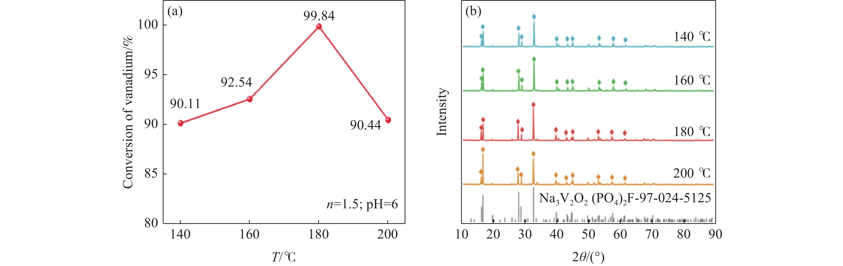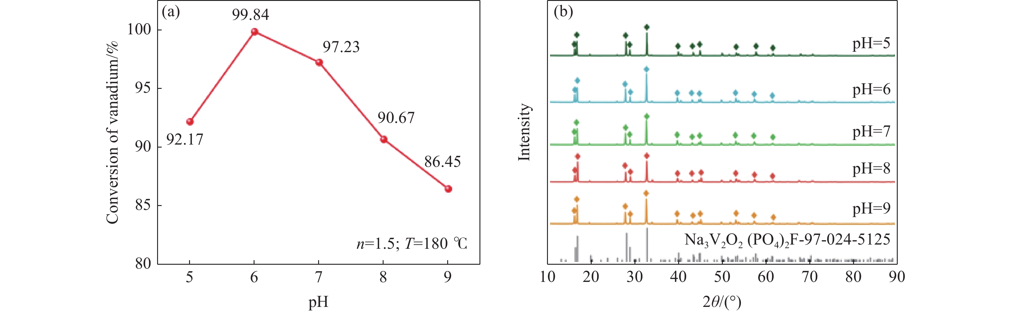 To address the dilemma of high-cost in using vanadium sources for the traditional preparation of sodium vanadium fluorophosphate (NVOPF), a novel solvothermal synthesis process was proposed. This method utilizes sodium-treated vanadium slag leaching solution as a substitute for high-purity vanadium sources, and successfully realized the direct conversion from metallurgical by-products to battery materials. In addition, the effects of the dosage of reducing agent citric acid (C6H8O7), solution pH, and synthesis temperature on vanadium conversion rate and material properties were investigated. The experimental results showed that with the increase of the dosage of reducing agent, pH, and temperature, the vanadium conversion rate showed a trend of first increasing and then decreasing. Under the conditions of pH value of solution of 6, molar ratio of citric acid to vanadium of 1.5, and solvothermal temperature of 180 °C, the synthesized NVOPF material exhibited a regular cubic block structure with vanadium in the +4 oxidation state (V4+) and the initial discharge capacity at a 0.2C rate was 68 mAh/g, demonstrating good structural stability and a third-cycle Coulombic efficiency of 96%. However, there is still a certain gap between the high-rate performance and actual capacity of the material and the theoretical value, which is primarily affected by the impurities in the leaching solution. This study provides a new solution for the high value added utilization of vanadium slag and the preparation of low-cost cathode materials for sodium-ion battery.