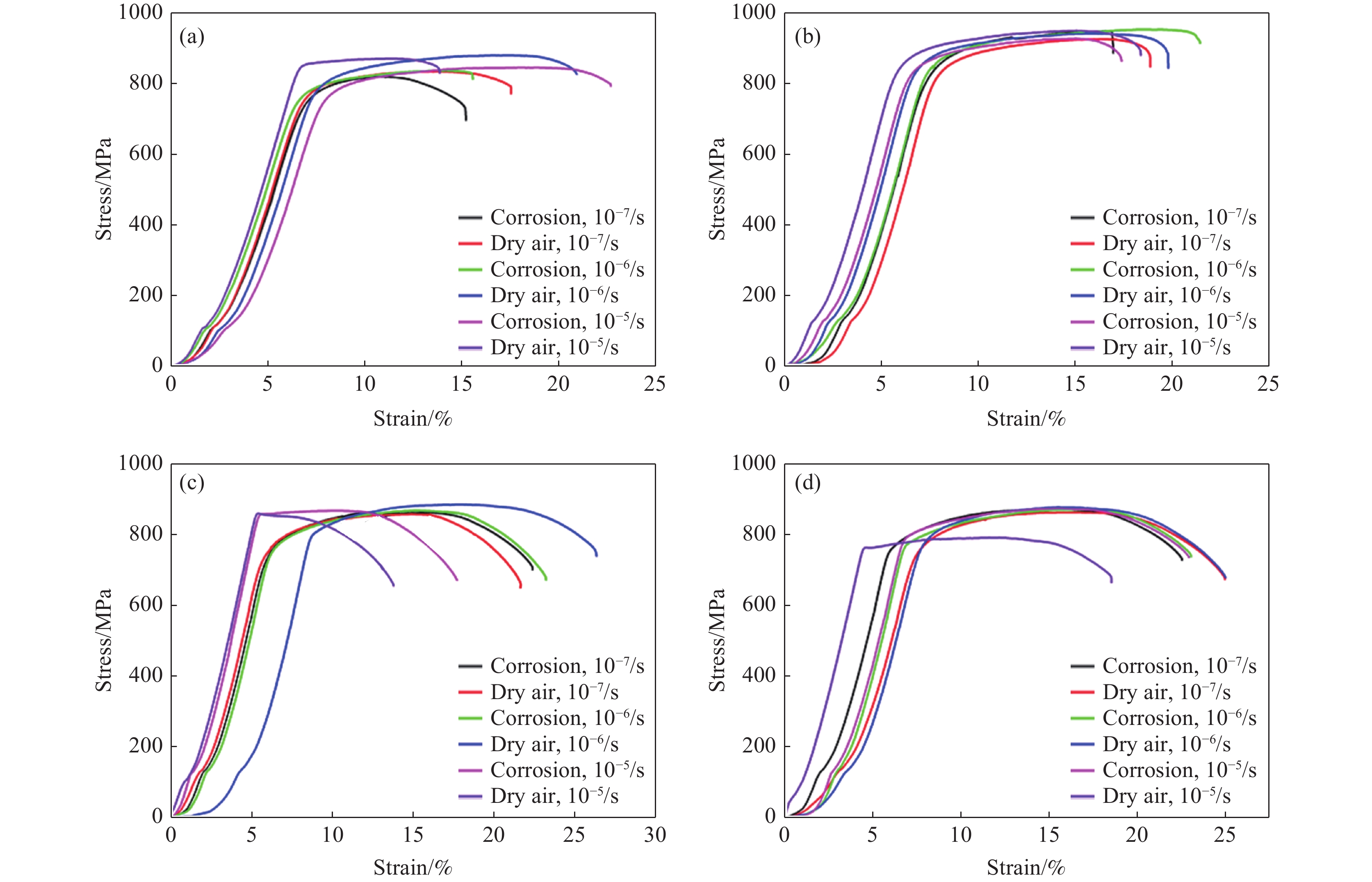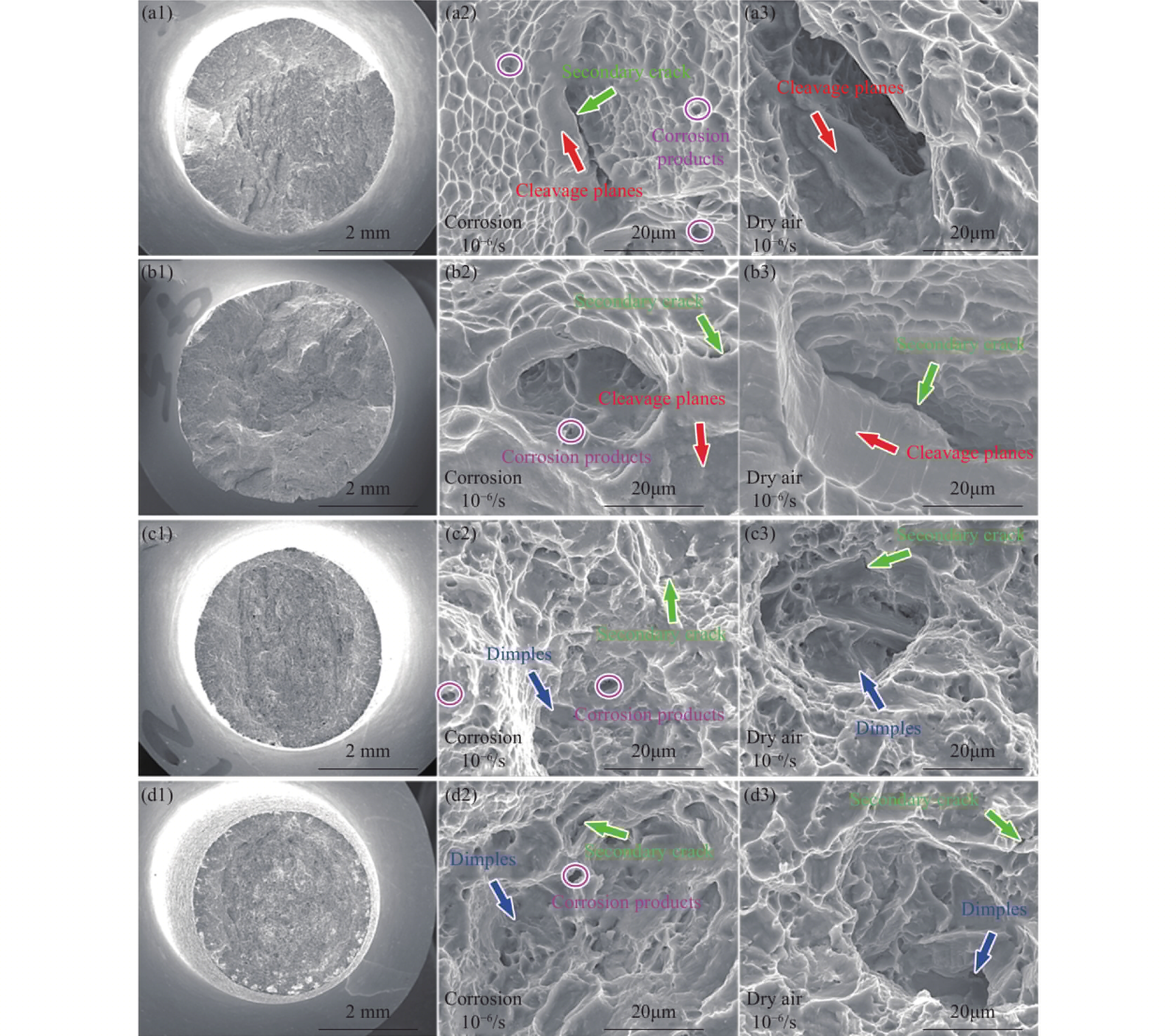 This paper investigates the stress corrosion cracking (SCC) susceptibility of low-cost Ti6411 plate, Ti52 tube, marine TC4 ELI, and Ti80 alloys under simulated deep-water environment pressure using a high-pressure autoclave testing system. Slow-strain-rate tests (10?5, 10?6/s, and 10?7/s) were exposed to 3.5% NaCl solution and dry air with a hydrostatic pressure of 7.5 MPa. The tensile parameters and stress corrosion susceptibility index (ISSRT) were obtained. Furthermore, the microstructures and fracture features have been observed to elucidate the stress corrosion behavior and failure mechanisms of low-cost titanium alloy plates and tubes using OM and SEM under simulated deep-water pressure. The results indicated that the optimal strain rate is within 10?5/s and 10?6/s. Specifically, the ISSRT values of Ti6411 plate are 10.0% and 9.1% with strain rates of 10?5/s and 10?6/s, respectively. A notable stress corrosion susceptibility was obtained. In contrast, all ISSRT values of Ti52 tube, TC4 ELI, and Ti80 alloys were below 5%, indicating no significant stress corrosion susceptibility. Particularly, Ti6411 plate with lamellar microstructure is sensitive to stress concentration effects and exhibits quasi-cleavage fracture. Some black corrosion products can be observed on the fracture morphologies. It is believed that the corrosion mechanisms were coupled effects of selective anodic dissolution and hydrogen embrittlement. Hydrostatic pressure can promote Cl- to weaken the passive film and increase hydrogen content. As a result, both of the tensile loading and internal hydrogen pressure reduce the corrosion resistance of the titanium alloys.