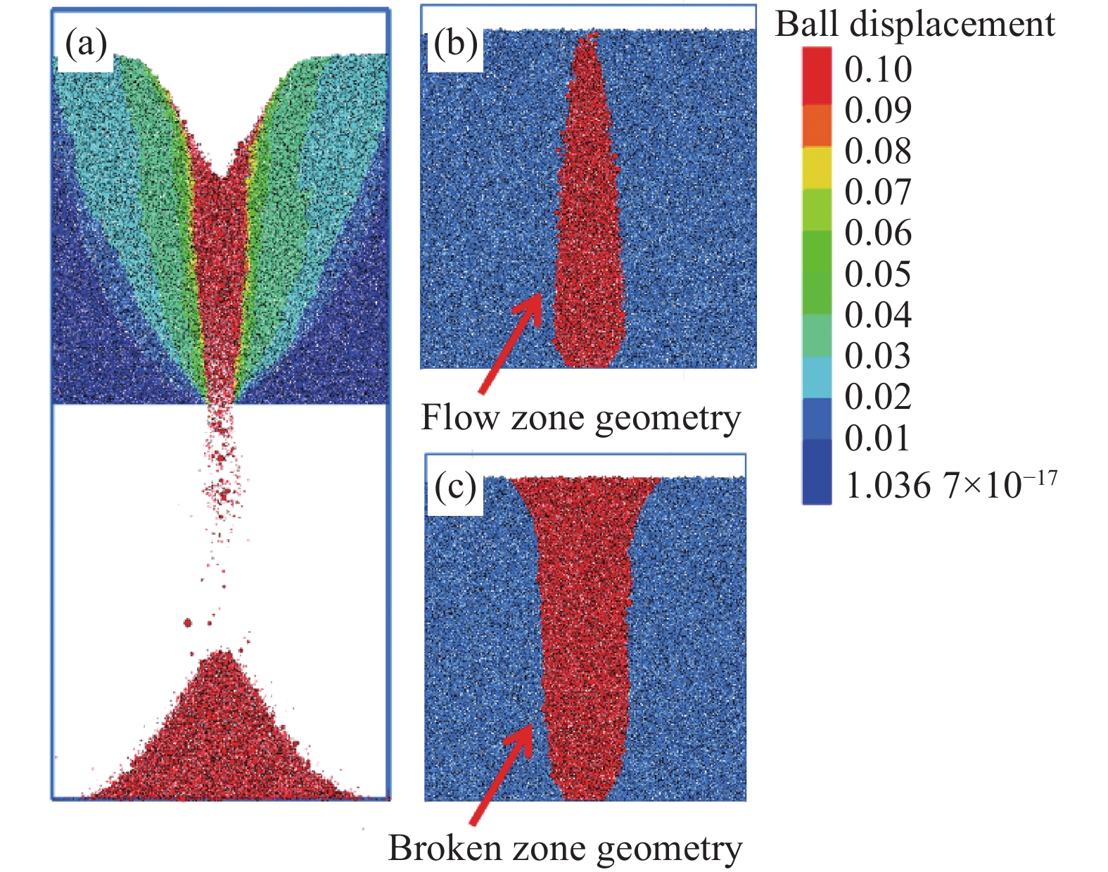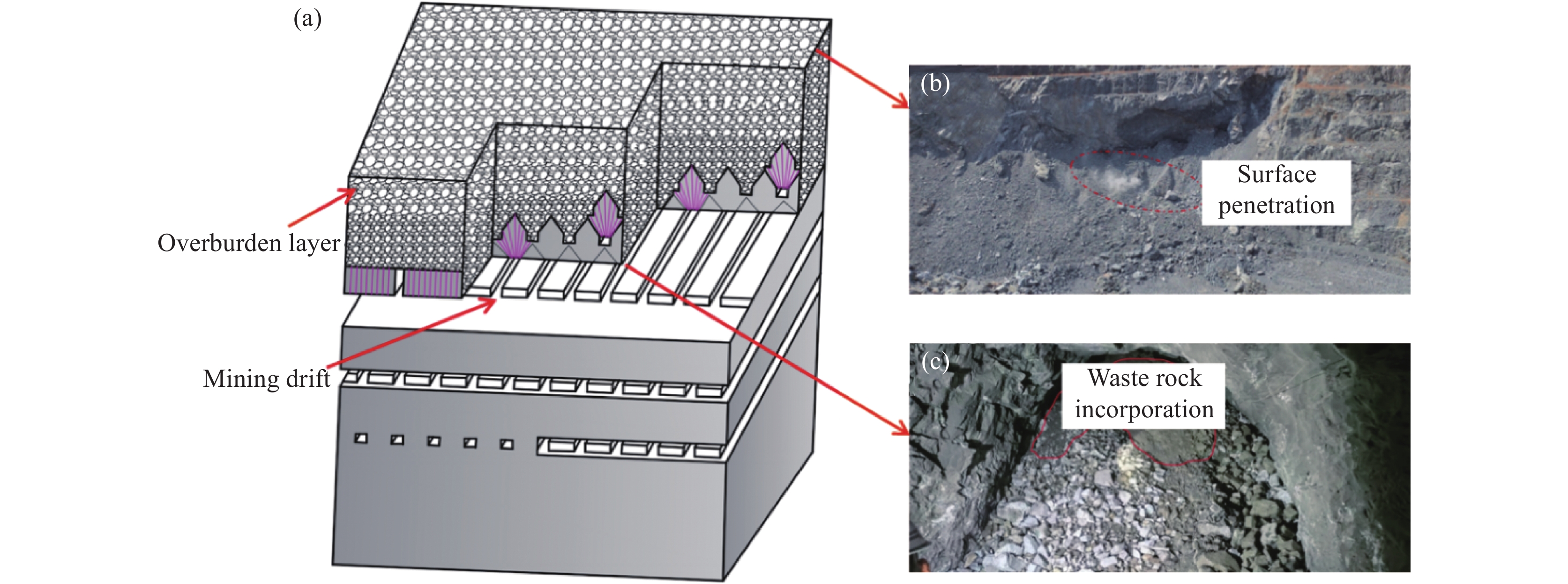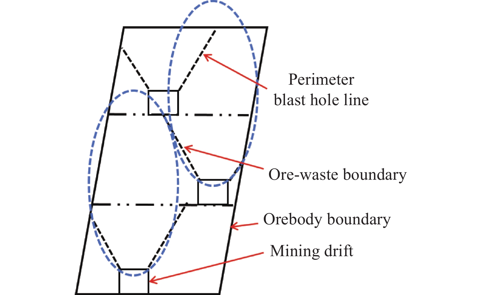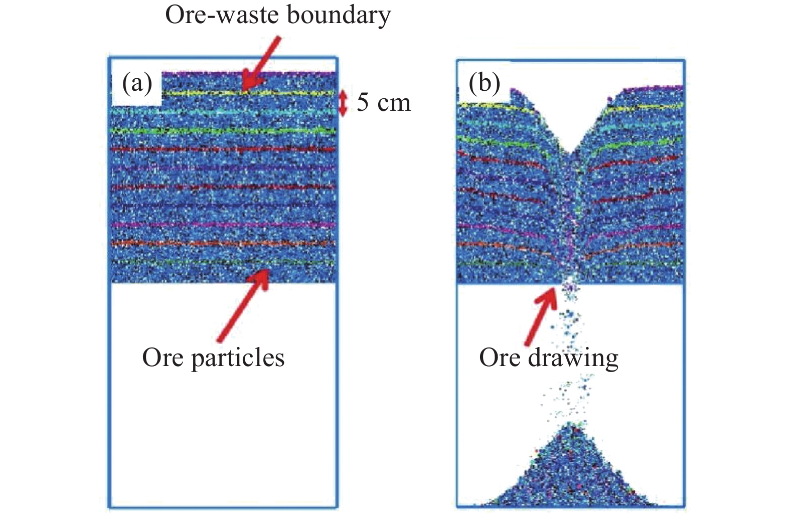 The flow behavior of rock and ore debris is one of the critical factors affecting the ore loss rate and dilution rate in the sublevel caving method. Based on the mining characteristics of an underground mine in the Panxi region, the shape of drawn-out body of rock and ore debris was determined using the hole volume measurement method, and numerical simulations were conducted with the "Particle flow code in 2 dimension (PFC2D) " software. The flow characteristics of the debris and their impact on the dilution and loss rates were analyzed. Results indicate that the drawn-out body of ore obtained from both numerical simulation and laboratory testing are largely consistent, exhibiting well-defined ellipsoidal development features. The primary cause of high dilution and loss rates is the incorporation of waste rock at the top, front, and sides of the drawn-out body of ore. Based on these findings, recommendations for optimizing the layout of the ore drawing openings were proposed, providing a theoretical foundation to enhance recovery rates at the mine.